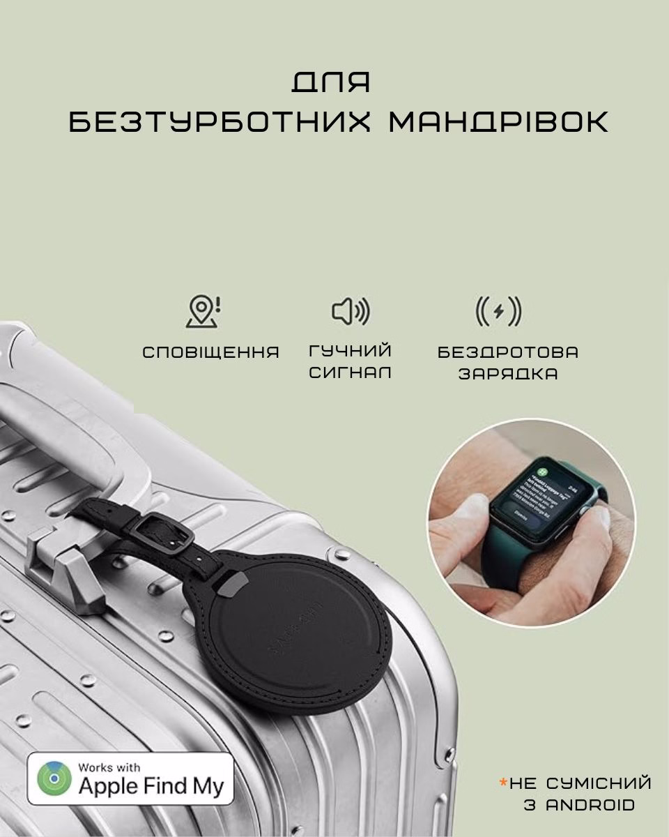 - Розумний трекер для відстеження багажу — інтеграція з Apple Find My дозволяє миттєво відстежувати місцезнаходження сумки або валізи.