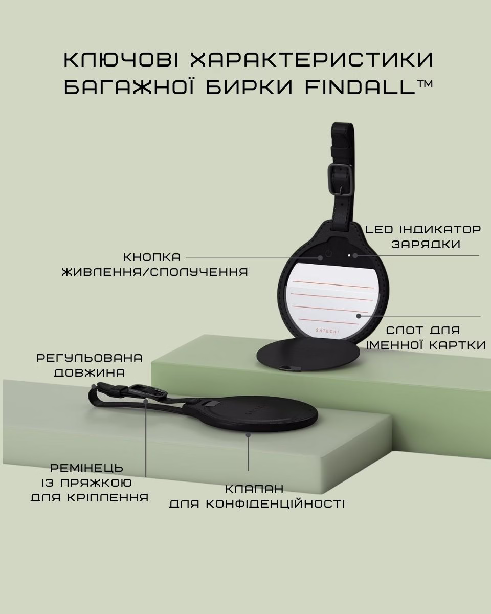 Інформація про власника — теж річ, яку хочеться зберігати під контролем. У багажної бирки Satechi FindAll™ для цього є зручний слот для картки з іменем, захований під акуратним клапаном, щоб сторонні не бачили ваших даних. Регульований ремінець і міцне металеве кільце надійно тримаються навіть тоді, коли валіза поспішає разом із вами — до гейту, у поїзд чи на бізнес-конференцію.