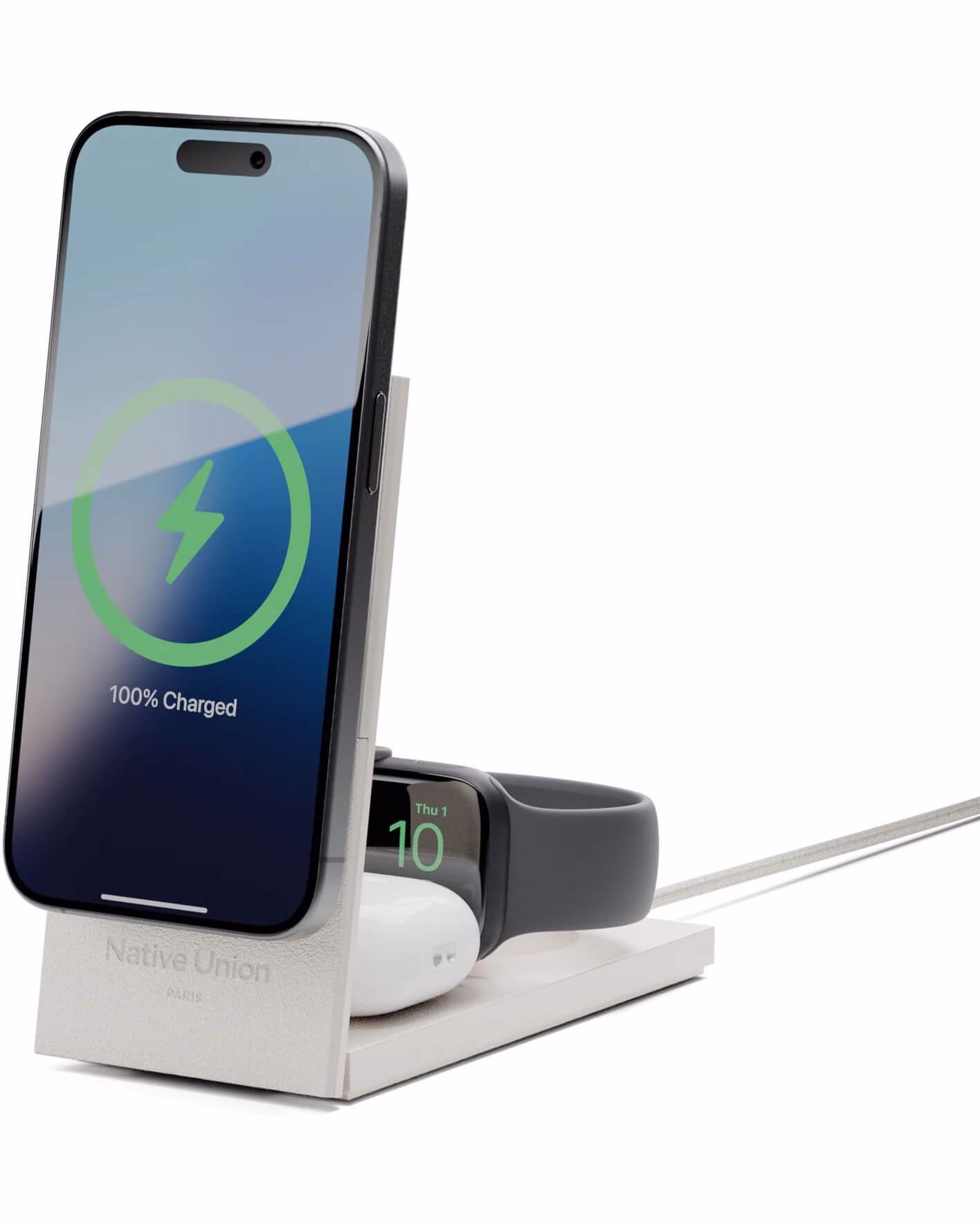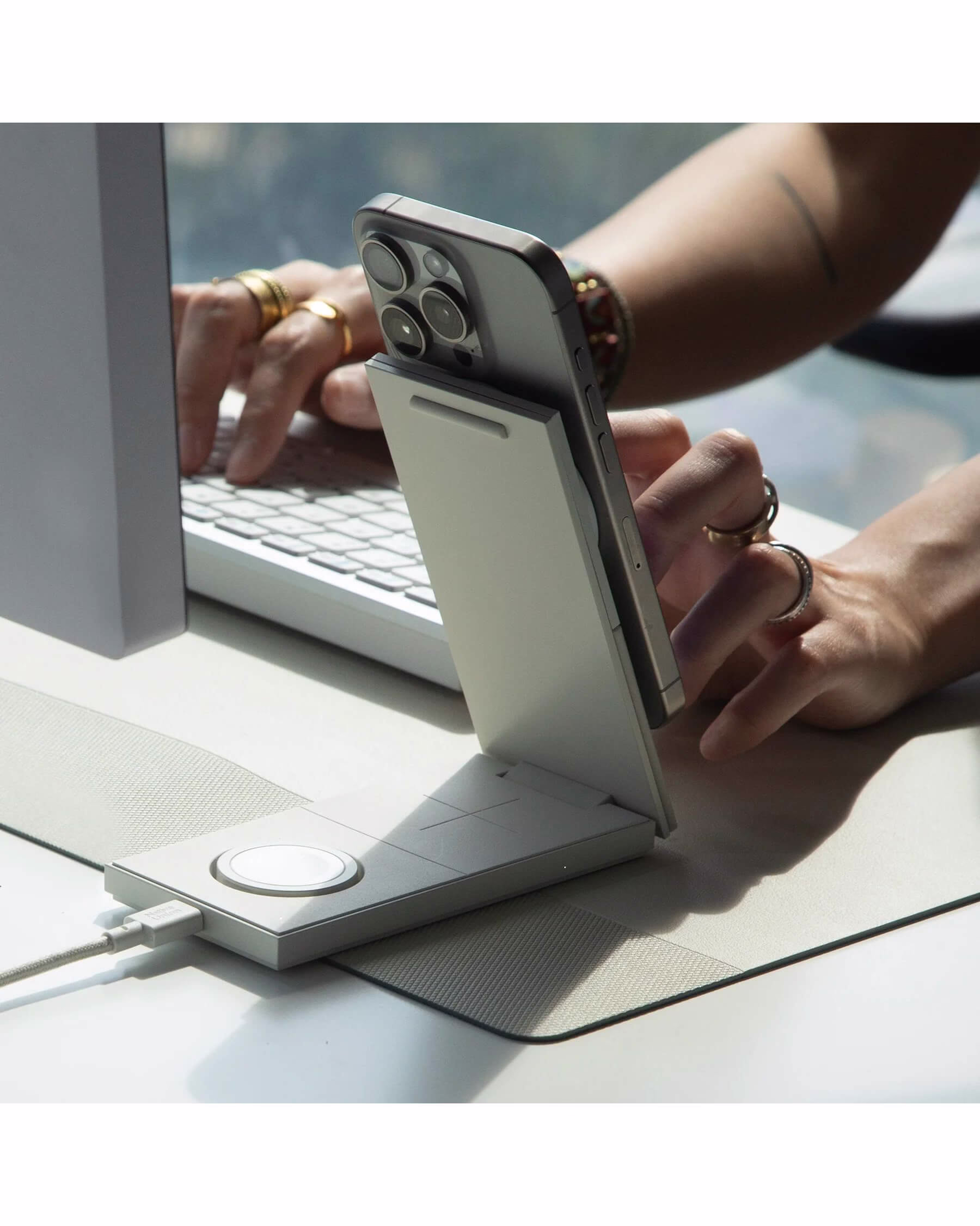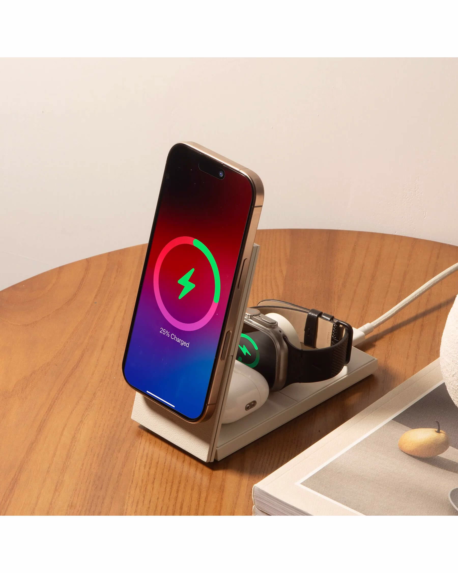 Rise 3-в-1 позбавить від зайвих кабелів і зробить процес живлення зручнішим та економнішим у просторі. Заряджай телефон у вертикальному положенні одночасно з AirPods та Apple Watch, або у складеному варіанті під зручним кутом.