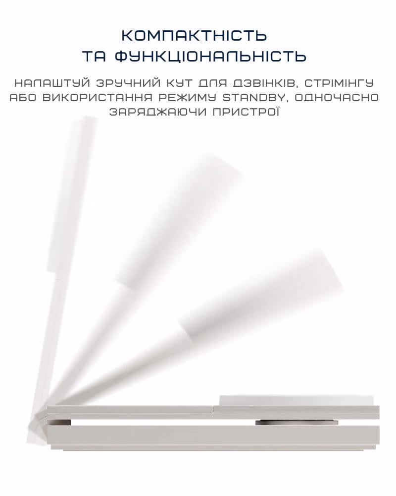 Завдяки регульованому куту нахилу твій телефон завжди в зручному положенні. Прокручуй екран у портретному режимі, повертай для стрімінгу в горизонтальному, або скористайся режимом StandBy, щоб бачити список справ і годинник. Безліч варіантів відображення дозволяють адаптувати зарядну станцію під твої потреби.