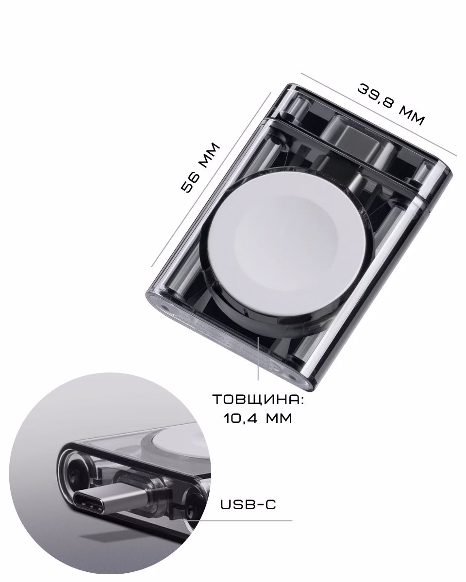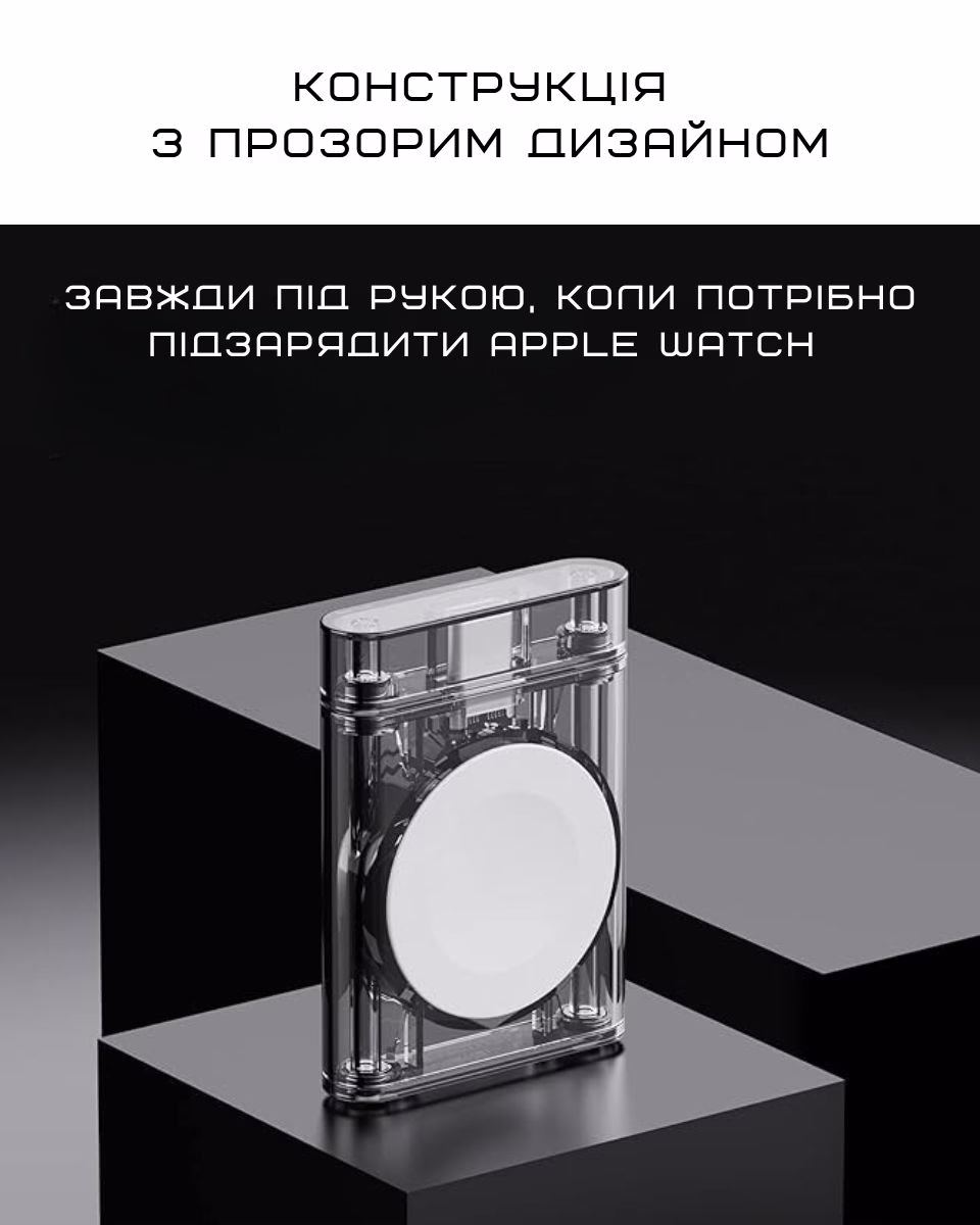 Зазирни всередину: прозорий корпус Power Dongle відкриває акуратну «начинку» зарядки без жодного кабелю — стильно і якось по-особливому. Легкий і компактний — зручно носити у кишені чи сумці. Завжди під рукою, коли потрібно підзарядити Apple Watch у дорозі.