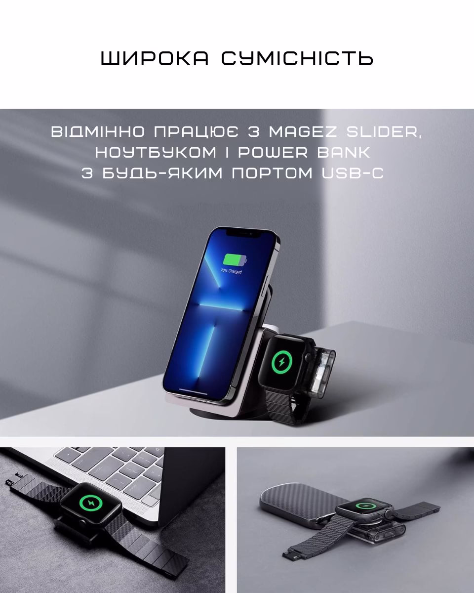 Ні, навпаки. Це ідеальне доповнення до USB-C-хабів, ноутбуків, павербанків. Просто встав і заряджаєш Apple Watch будь-де — навіть без розетки. Жодних зайвих кабелів.