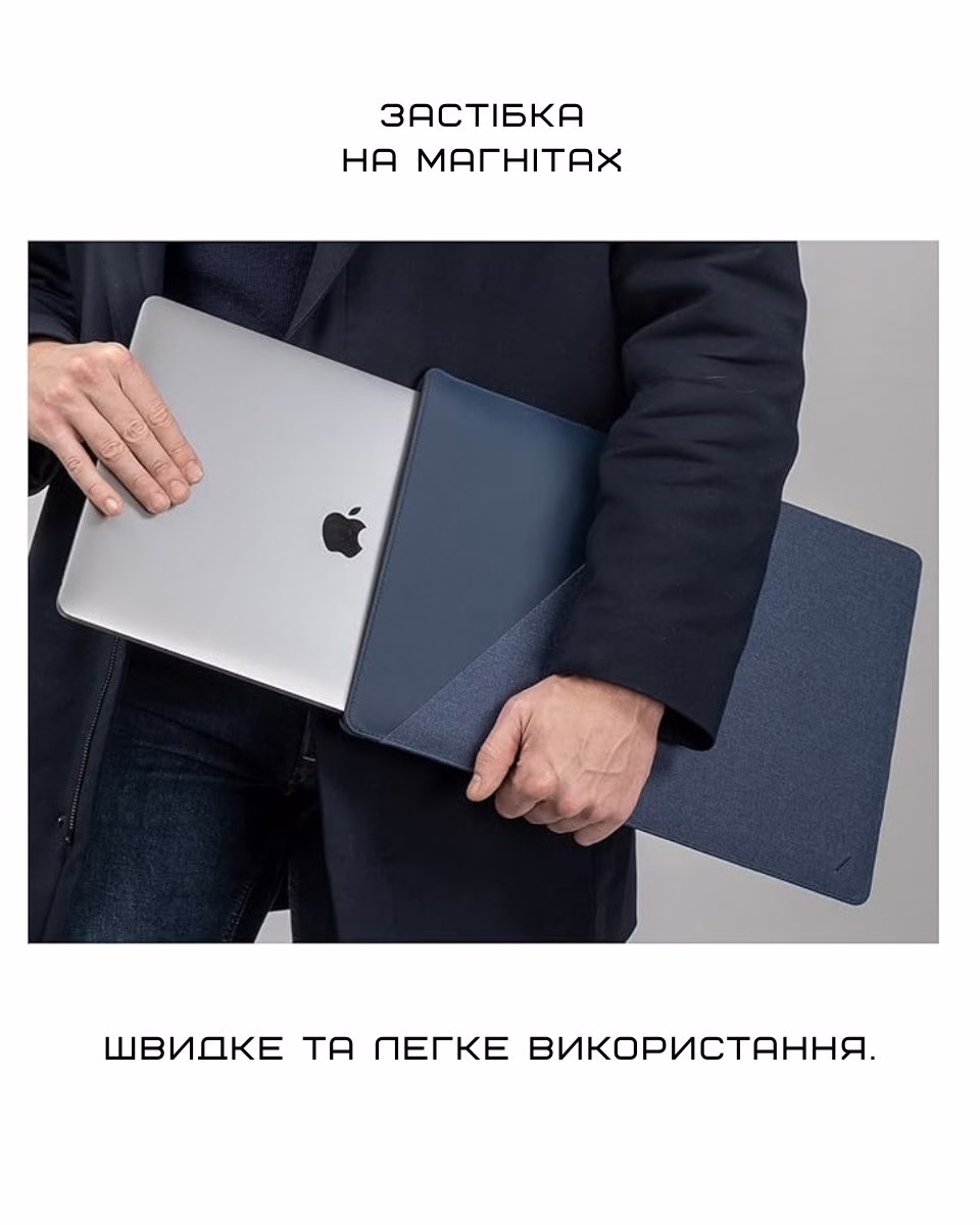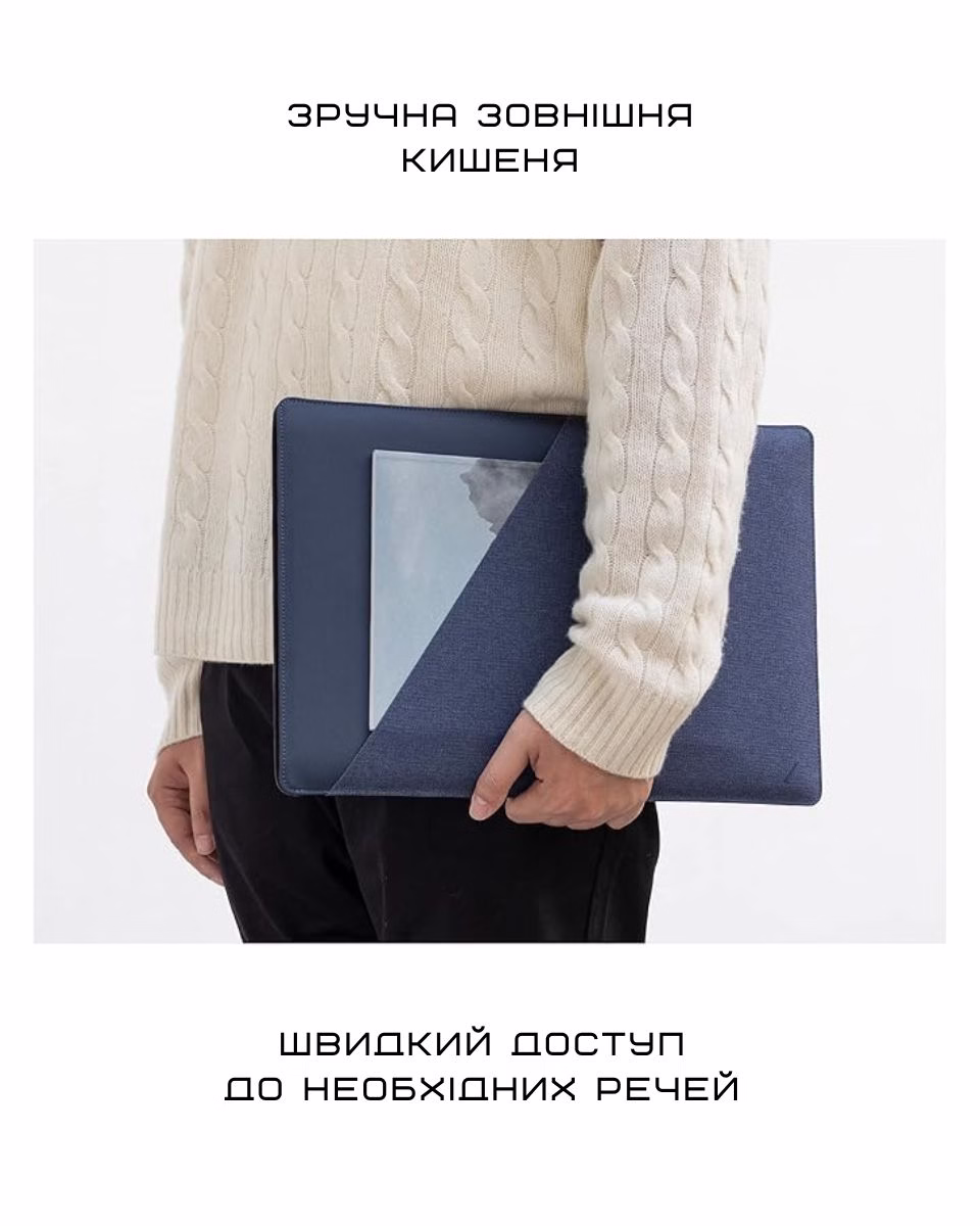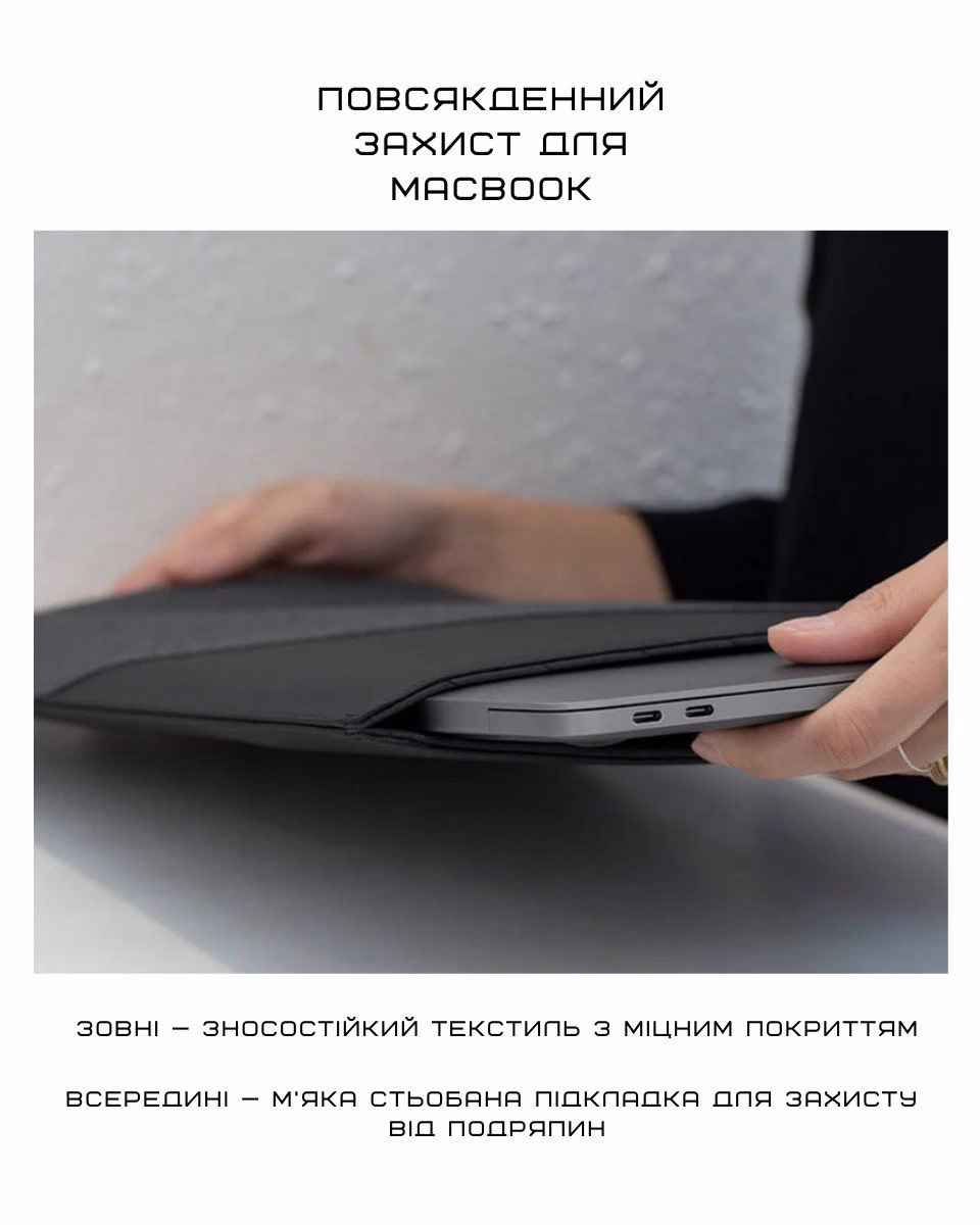- Захист з усіх боків: міцна текстильна зовнішня частина протистоїть зносу, а м’яка стьобана підкладка захищає MacBook від подряпин.