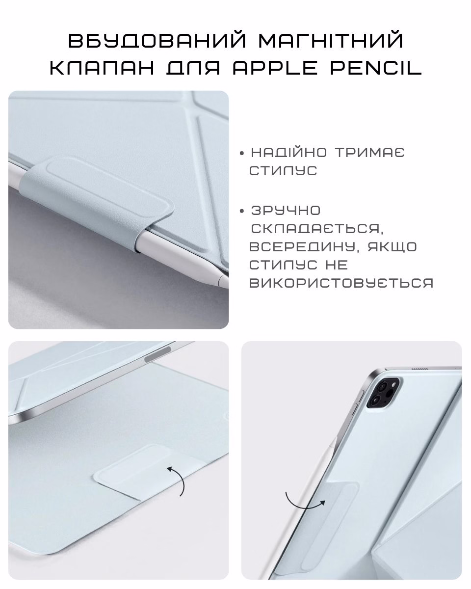 Магнітне кріплення та тонкий і легкий профіль. Він не додає зайвого об'єму і дозволяє надійно фіксувати iPad в різних положеннях для роботи чи відпочинку.3. Наскільки він надійний?