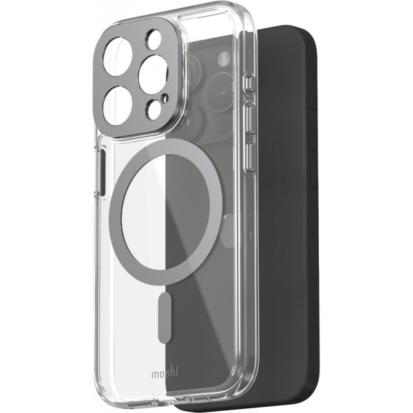 Гібридний захисний чохол Moshi iGlaze у версії MagSafe з ультрапрозорого та міцного полікарбонату. Новий iGlaze покращено прозорим тришаровим покриттям, яке запобігає пожовтінню. Вбудоване кільце з високоякісними магнітами забезпечує швидку зарядку за допомогою зарядного пристрою MagSafe і відмінне зчеплення аксесуарів (наприклад, гаманця, бездротового павербанка або автомобільного тримача). Чохол також оснащений алюмінієвим корпусом для острівця камери, який захищає об'єктиви камери. Інтегровані кнопки гучності та кнопка пробудження забезпечують ефективну роботу всіх функцій телефону, обмежуючи при цьому потрапляння бруду в корпус.