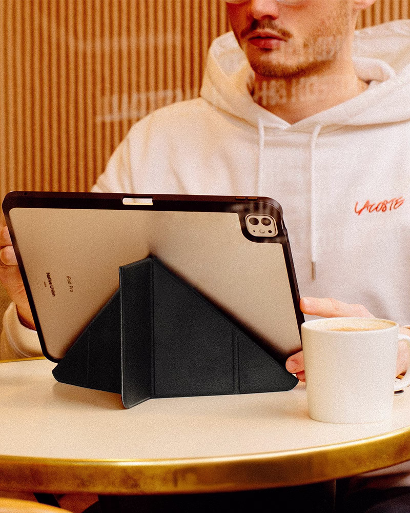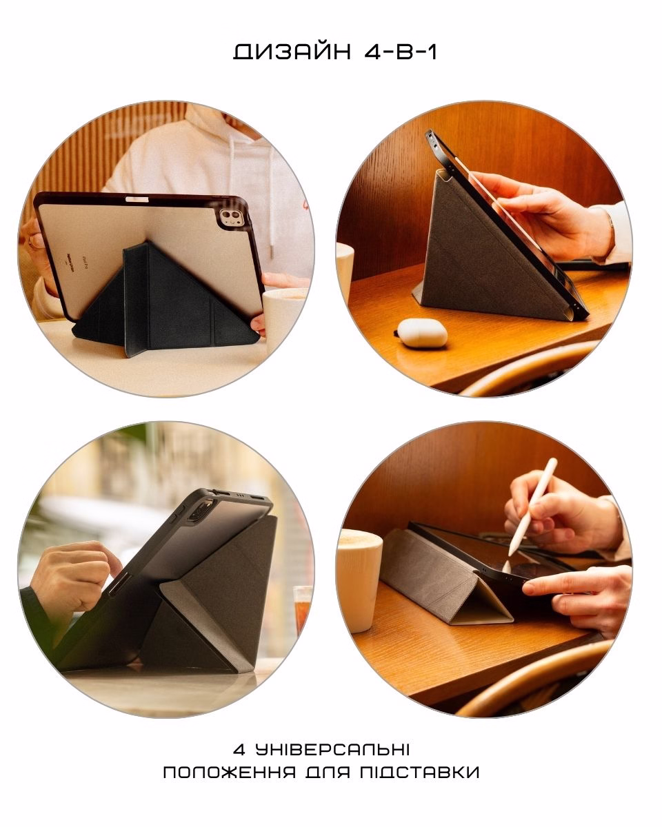 Чохол Active Case створений для тих, хто цінує комфорт та продуктивність. Передня панель легко трансформується у підставку, пропонуючи чотири варіанти положення залежно від завдань. Перегляд відео, малювання, набір тексту або відеодзвінки — кожен режим має свій оптимальний кут нахилу для максимальної зручності.
