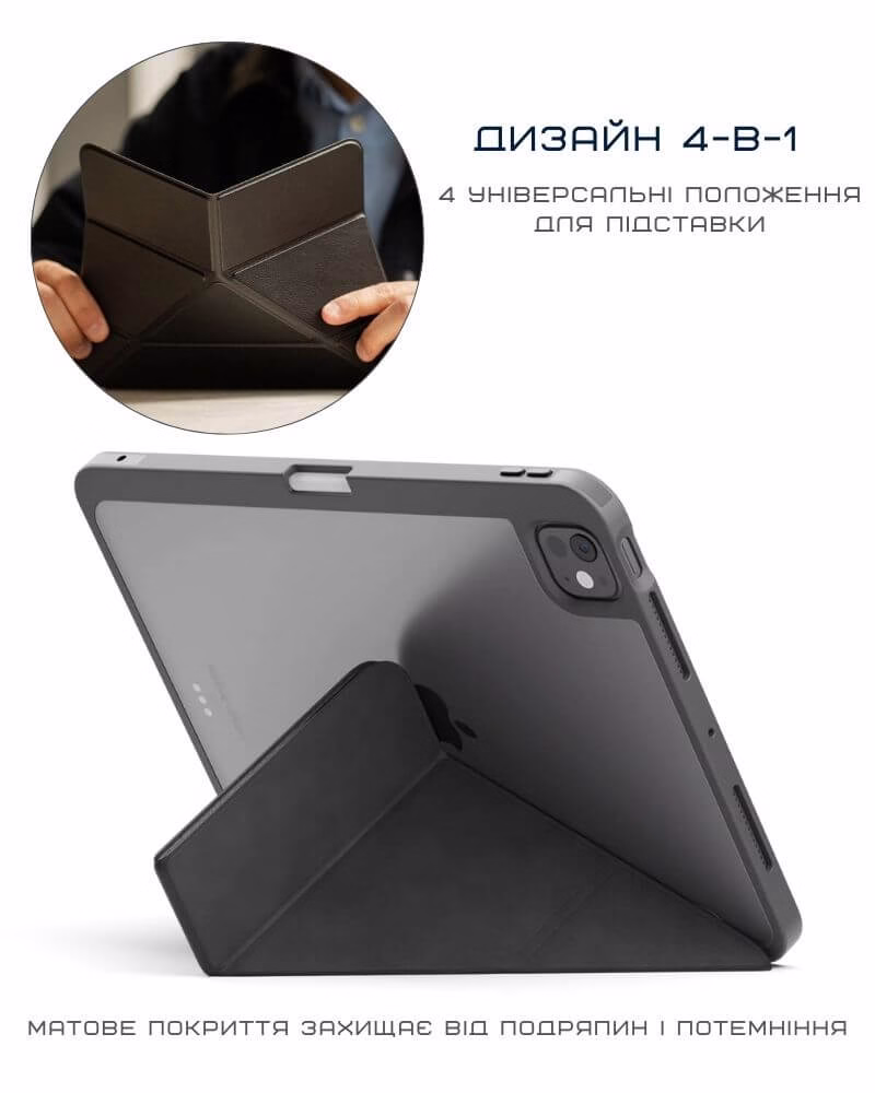 Чохол Active Case створений для тих, хто цінує комфорт та продуктивність. Передня панель легко трансформується у підставку, пропонуючи чотири варіанти положення для будь-яких завдань. Переглядай відео, малюй, набирай текст або веди відеодзвінки – обирай кут нахилу, який найкраще відповідає твоєму ритму життя.