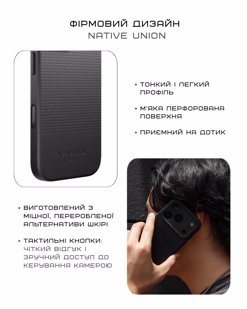 Native Union інтегрували MagSafe-магніт в саму структуру чохла, тож бездротова зарядка працює швидко й стабільно, без перегріву телефона.