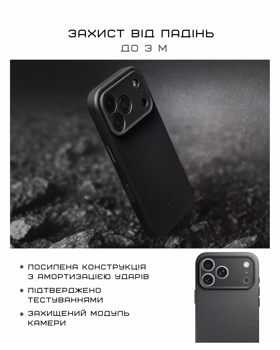 Лаконічний дизайн поєднується з серйозним захистом від падінь до 3 м. Поверхня з дрібною перфорацією м’яка та приємна на дотик, а сам чохол зручно лежить у руці й обережно огортає телефон з усіх боків. Модуль камери акуратно обрамлений і візуально відокремлений від корпусу, щоб допомогти захистити лінзи у щоденному користуванні.
