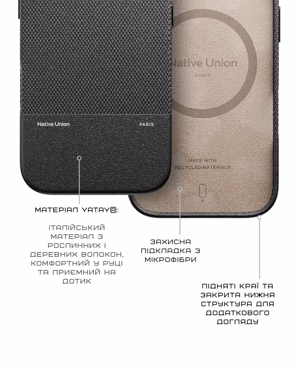 Серія (RE) Classic від Native Union — це відповідь на запит світу, що змінюється. Бренд використовує Yatay® — сучасний італійський біо-матеріал На дотик він зернистий, м’який і теплий. У щоденному користуванні — витривалий і практичний. Конструкція чохла розроблена таким чином, щоб кожна деталь працювала на захист смартфона, не обтяжуючи його.