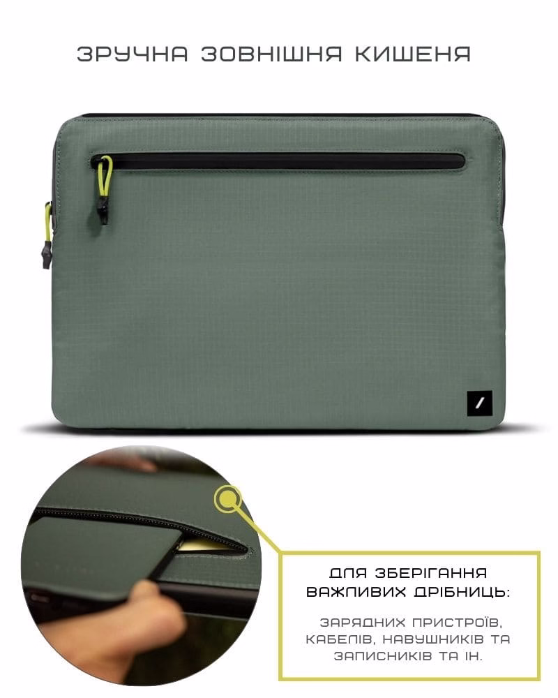 Завдяки продуманій організації, Ultralight Sleeve має додаткову зовнішню кишеню для зберігання важливих дрібниць: зарядних пристроїв, кабелів, навушників чи записників. Вдалий вибір, щоб тримати всю техніку в одному місці або носити чохол самостійно, зберігаючи все необхідне під рукою. Легкий, гнучкий і приємний на дотик матеріал, який витримує щоденні навантаження.