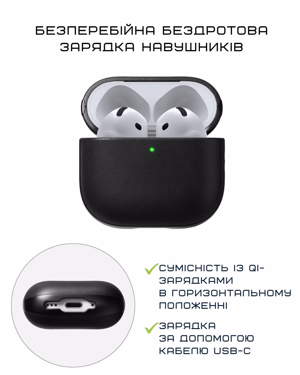 Nomad Modern Leather Case не перешкоджає бездротовій зарядці навушників. Тож, немає потреби знімати чохол, щоб зарядити AirPods — достатньо горизонтально покласти їх на зарядці або скористатись кабелем USB-C.
