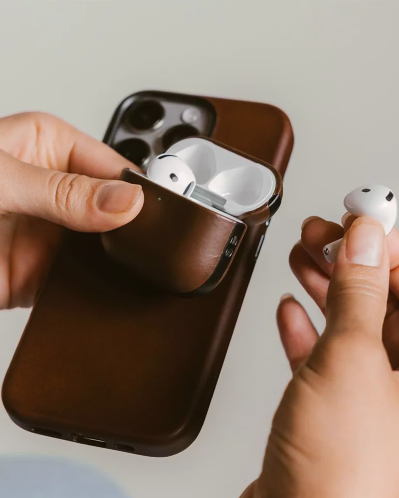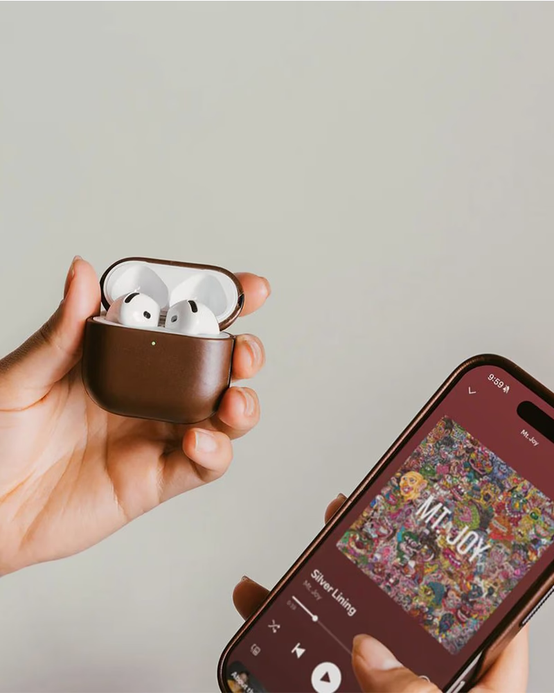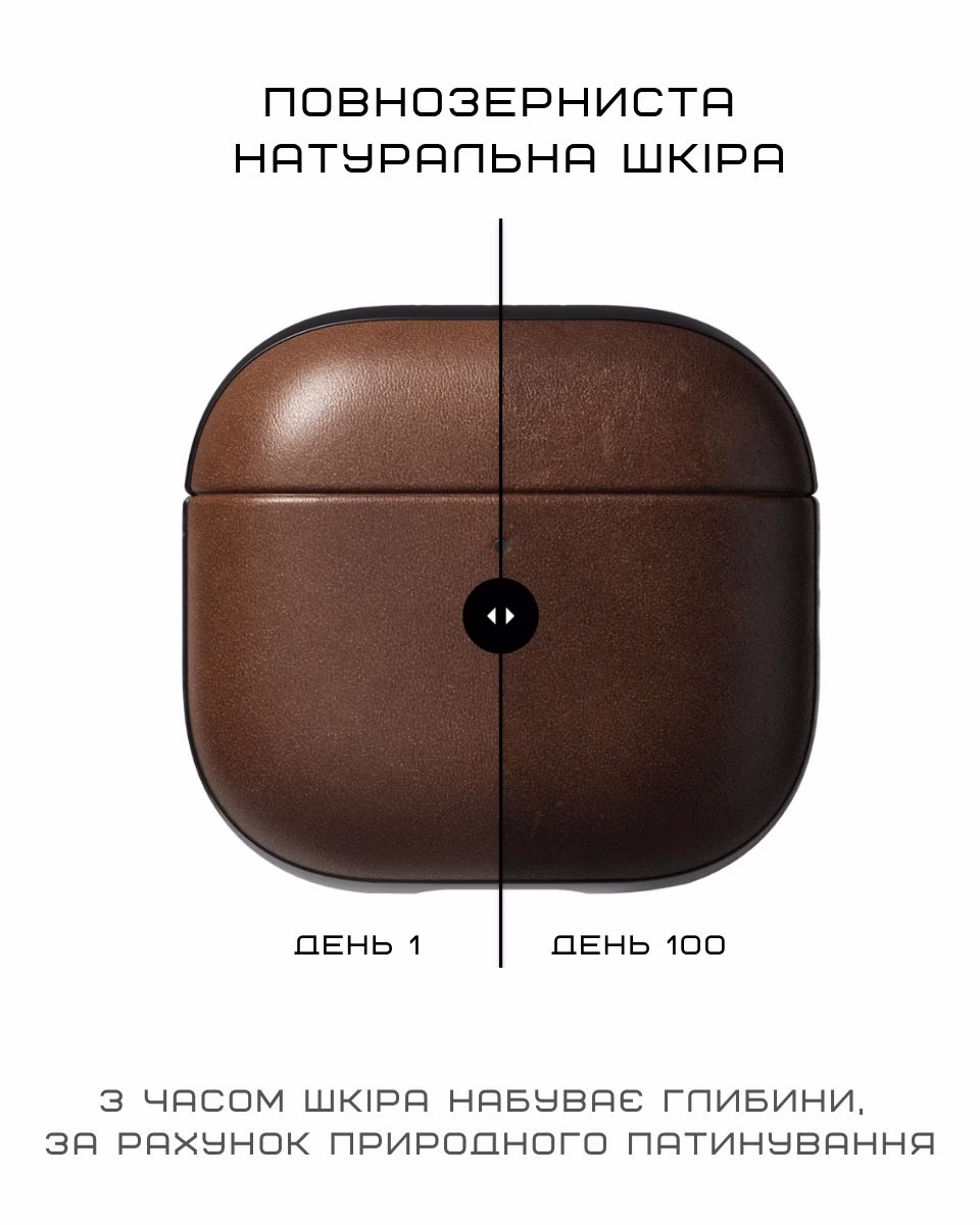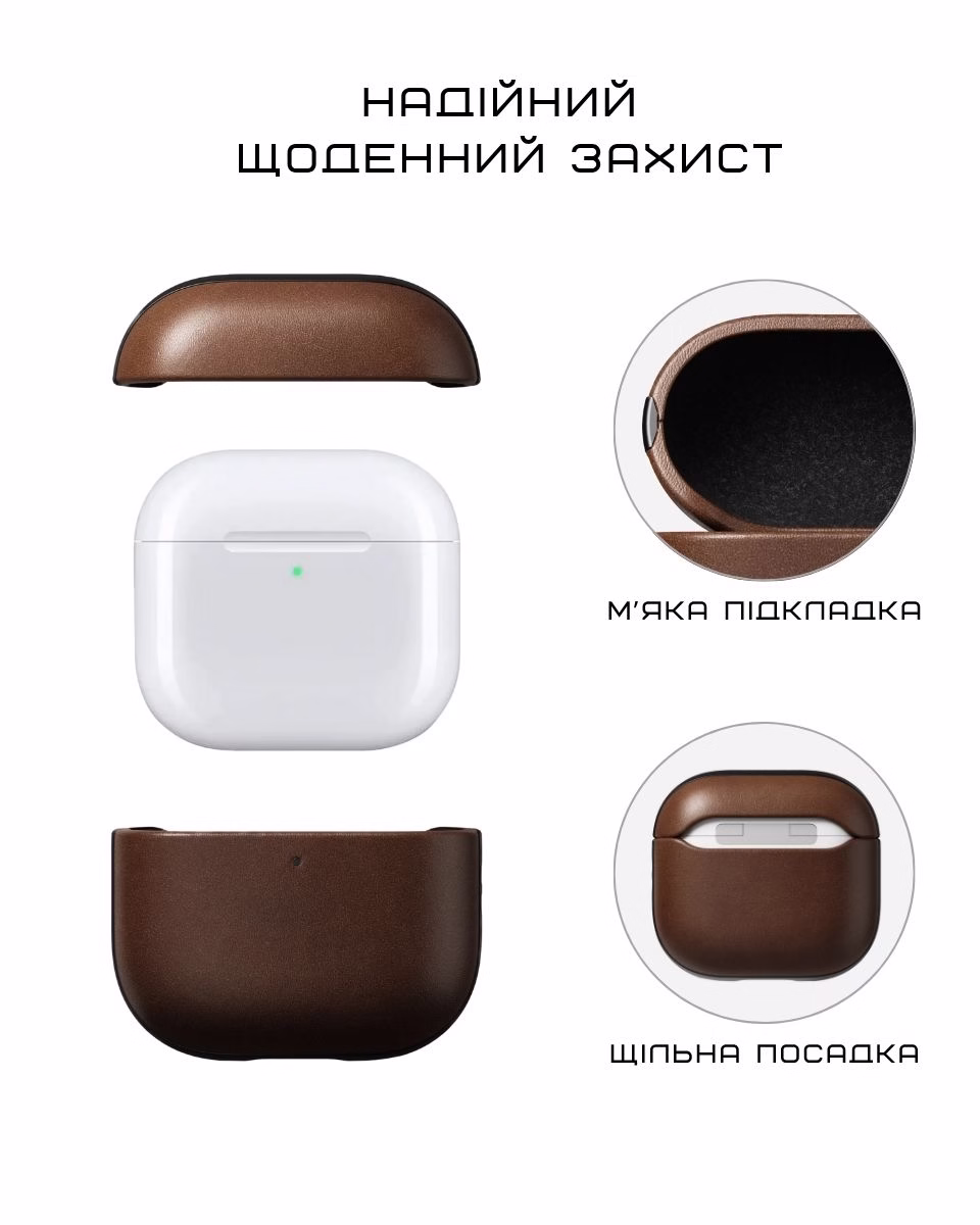 Натуральна повнозерниста шкіра зовні, м’яка мікрофібра всередині — усе для надійного захисту та стильного вигляду. Легкий, двосекційний дизайн зберігає форму кейсу, зручно лежить у руці й захищає від подряпин та падінь. Отвір для індикатора зарядки, акуратний виріз для динаміка та місце для кріплення шнурка роблять користування ще комфортнішим. Амортизуючі властивості та м’який внутрішній шар мікрофібри поглинають удари та поштовхи, кожного дня надійно захищаючи AirPods.