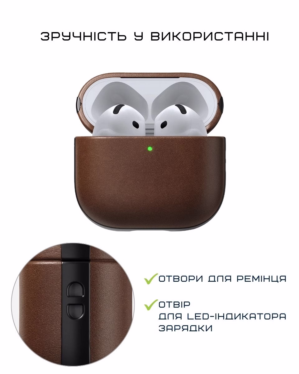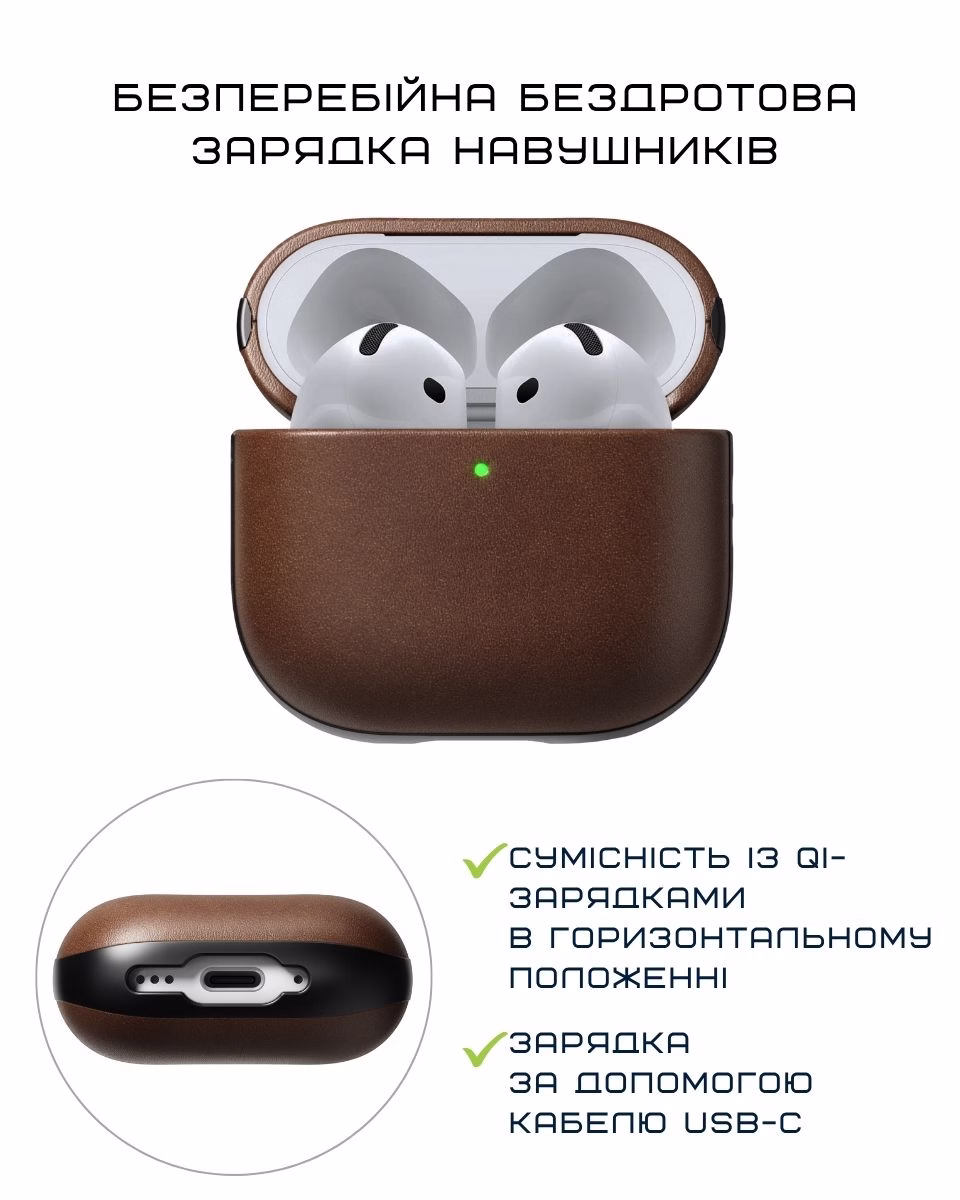 Nomad Modern Leather Case не перешкоджає бездротовій зарядці навушників. Тож, немає потреби знімати чохол, щоб зарядити AirPods — достатньо горизонтально покласти їх на зарядці або скористатись кабелем USB-C.