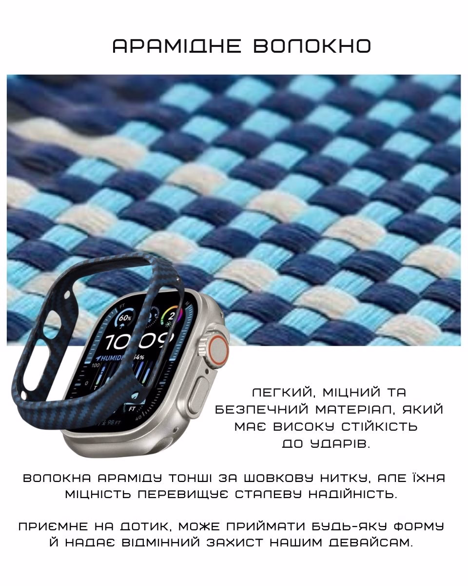 Тому що це преміальний аксесуар, створений із дорогого й надзвичайно міцного арамідного волокна. Забезпечує реальний захист від подряпин і потертостей. Завдяки ідеальній формі, чохол майже не видно на годиннику — ніщо не порушує дизайн Apple Watch. Це вибір для тих, хто цінує не тільки функціональність, а й естетику, легкість і довговічність.
