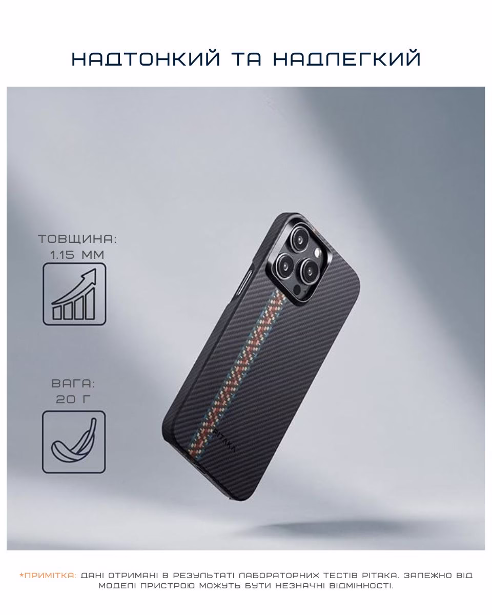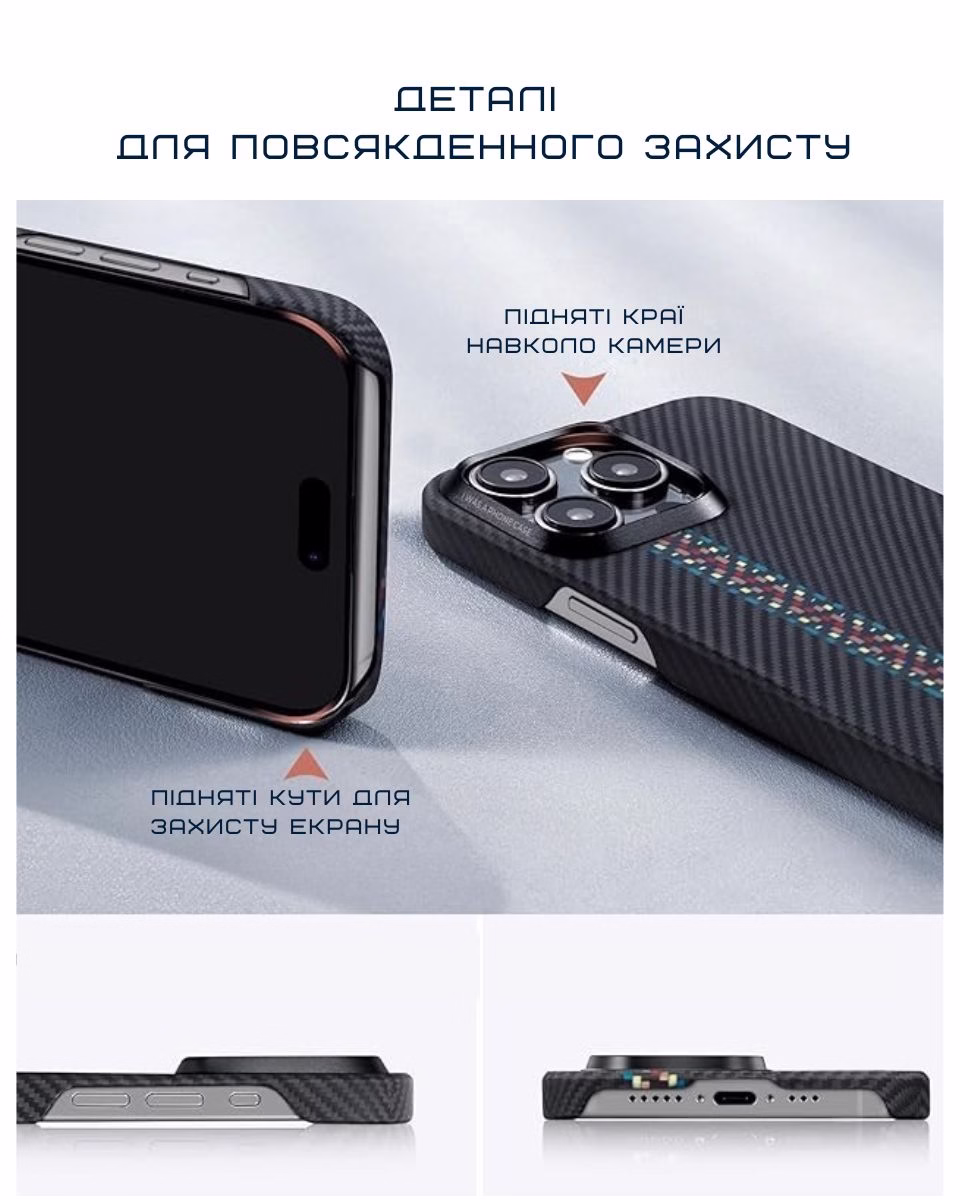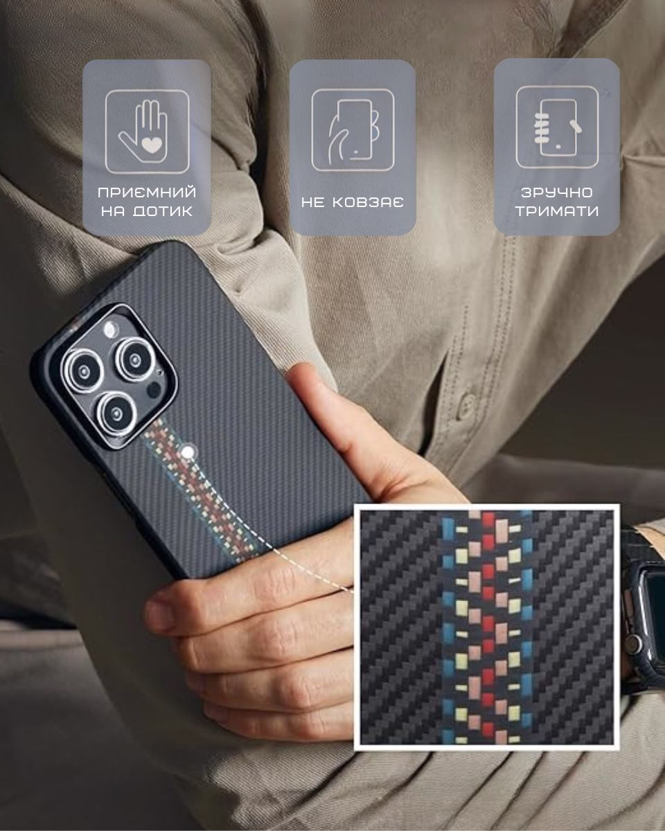 Надміцний чохол з арамідного волокна захищає телефон від несподіваних падінь, подряпин та ударів. Стильний, невагомий та надійний аксесуар преміальної якості, який не захочеться випускати з рук.