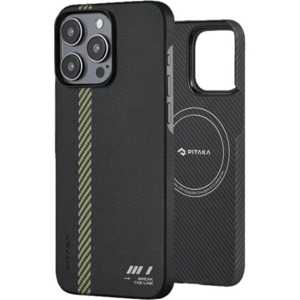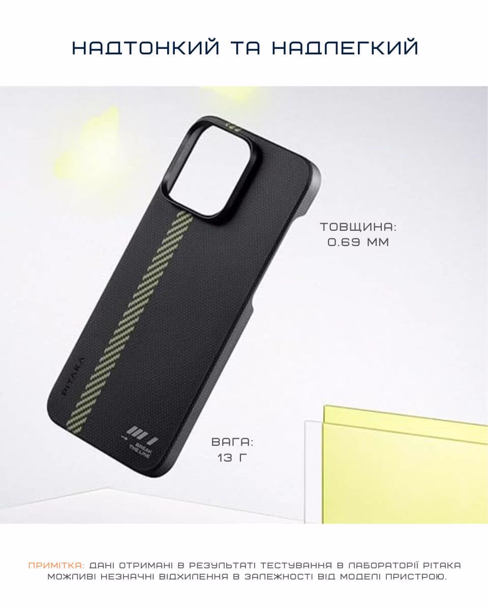 У дизайн чохла Break the Line із серії Fusion Weaving, як і у всі свої дизайни, бренд вклав певний маніфест. Він про тих, хто не боїться досліджувати межі, ламати шаблони та відкривати нові горизонти у непередбачуваному світі. Витканий із арамідного волокна в техніці Fusion Weaving, чохол має естетику з майбутнього: чорна база з яскраво-зеленою лінією — як світло в тунелі, як знак, що настав час перейти межу.
