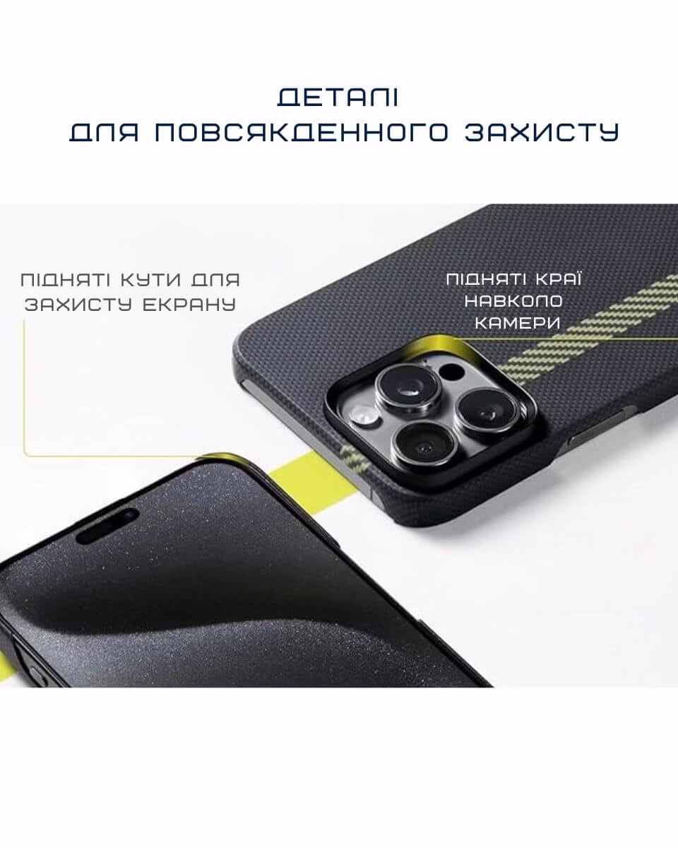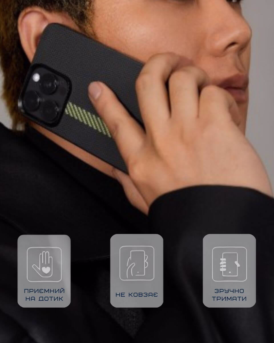 Надміцний чохол з арамідного волокна захищає телефон від несподіваних падінь, подряпин та ударів. Стильний, невагомий та надійний аксесуар преміальної якості, який не захочеться випускати з рук.