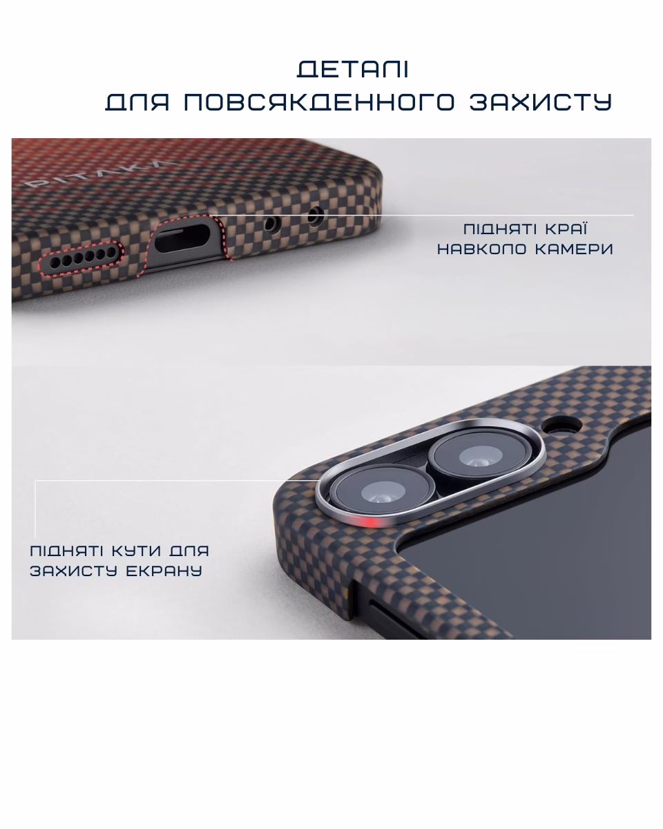 Надміцний чохол з арамідного волокна захищає телефон від несподіваних падінь, подряпин та ударів. Стильний, невагомий та надійний аксесуар преміальної якості, який не захочеться випускати з рук.