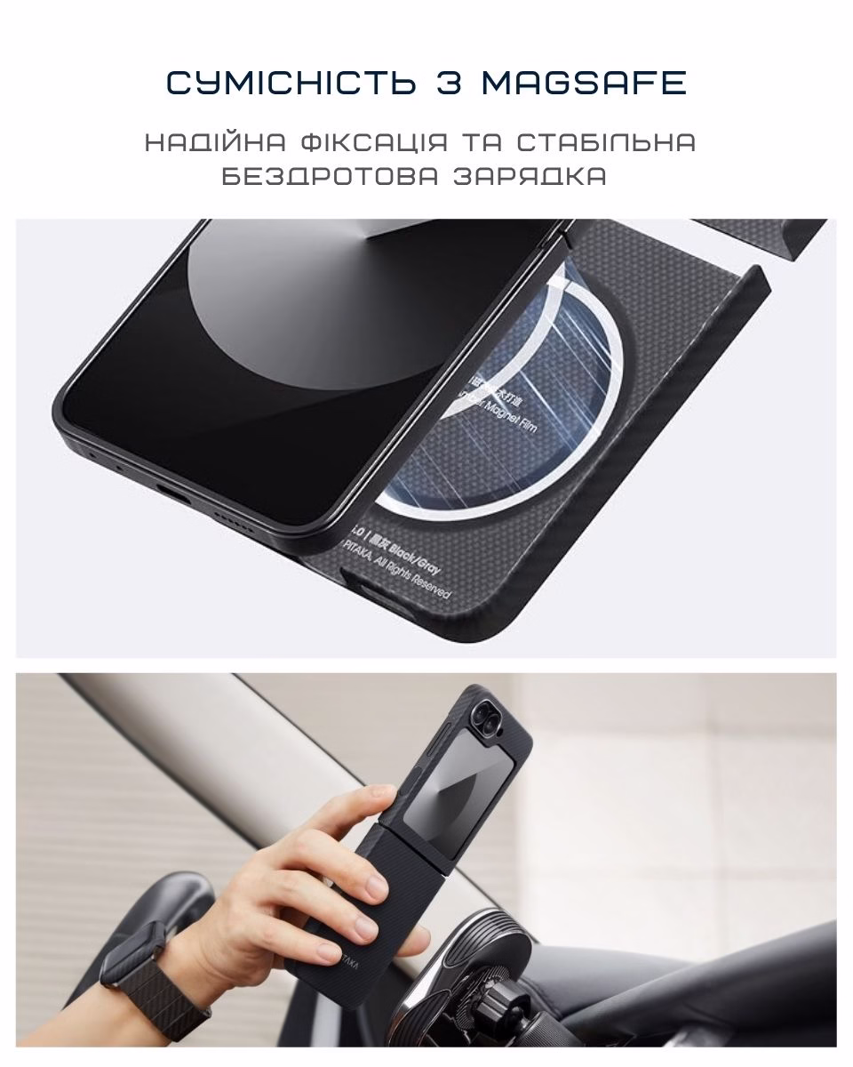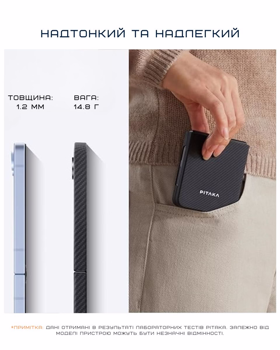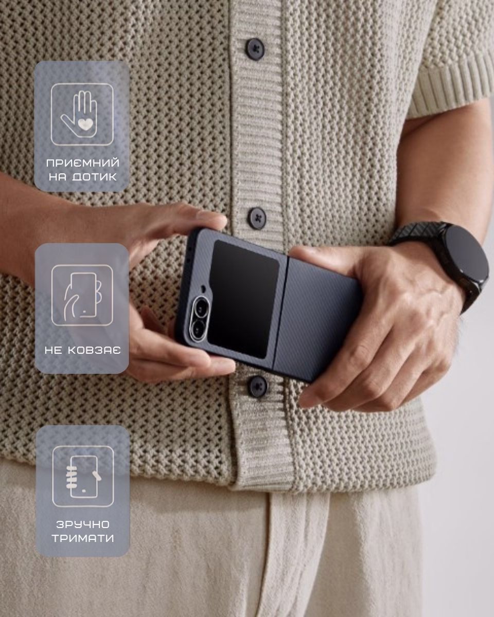 Це надлегкий захист, який не порушує геометрію складного смартфона. Жодного тиску на шарнір, ніякої масивності — усе продумано до дрібниць. Він майже не відчувається в руці, але дає чітке відчуття міцності.