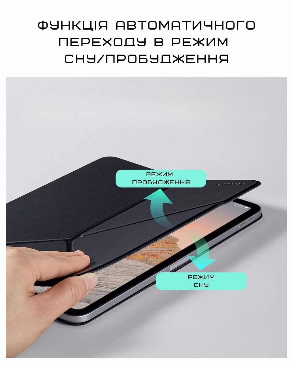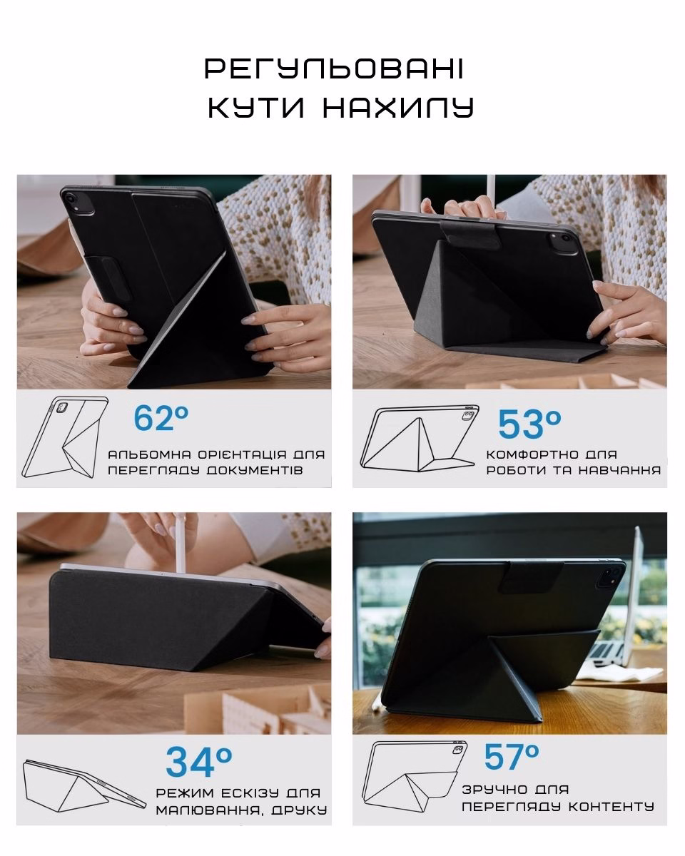 Легкий і компактний, зручно носити з собою, не додає зайвого обʼєму. Матовий корпус приємний на дотик, а сам чохол виглядає стильно і охайно. Вранці за кавою, вдень за навчанням чи проєктами, в дорозі за переглядом контенту - чохол подбає про комфорт завдяки регульованим кутам нахилу та захистить планшет від подряпин.