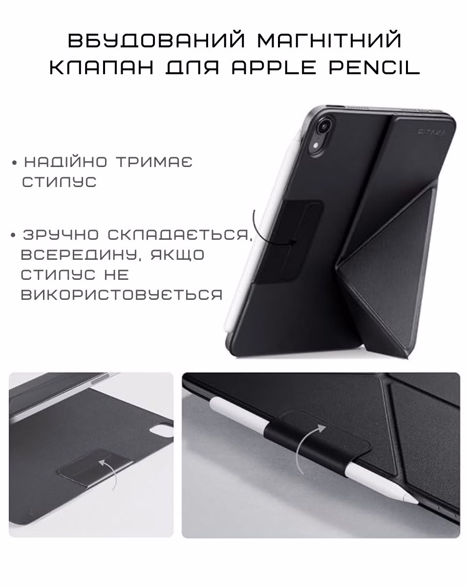 Легко встановлюється одним рухом і так само просто знімається. Підтримує функцію автоматичного сну та пробудження, яка заощаджує заряд батареї та позбавляє зайвих рухів. Вбудований магнітний клапан для Apple Pencil: якщо ти не використовуєш стилус, можна просто сховати клапан всередину.