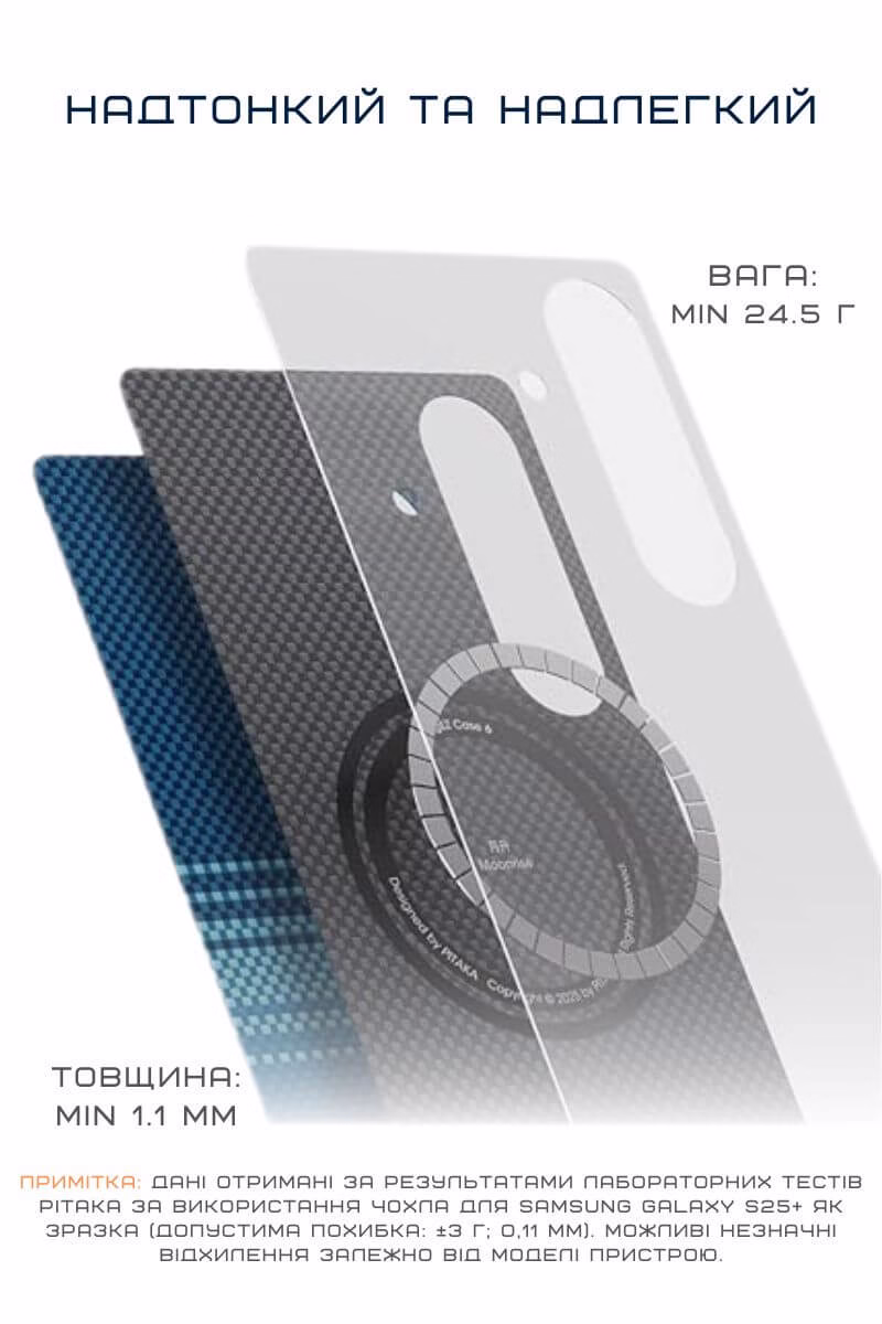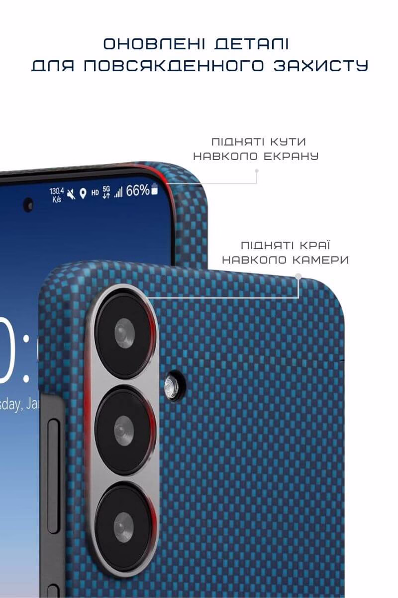 Хоча чохол виглядає елегантно та не масивно, він виготовлений із композиту арамідного волокна зі смолою — надлегкий і міцний матеріал. Посилені краї та виступи по периметру забезпечують захист від подряпин і щоденних ударів.