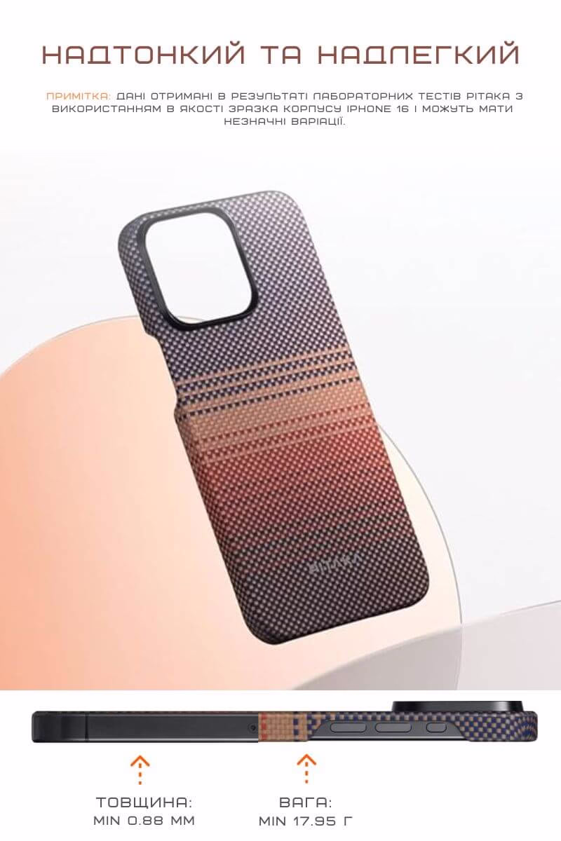Колекція Sunset переносить у момент, коли сонце згасає за горизонтом і починає проявлятися місяць, захоплюючи своєю красою та переливами відтінків. З чохлом Pitaka твій телефон стане частиною твого стилю, що привертає увагу і викликає емоції.