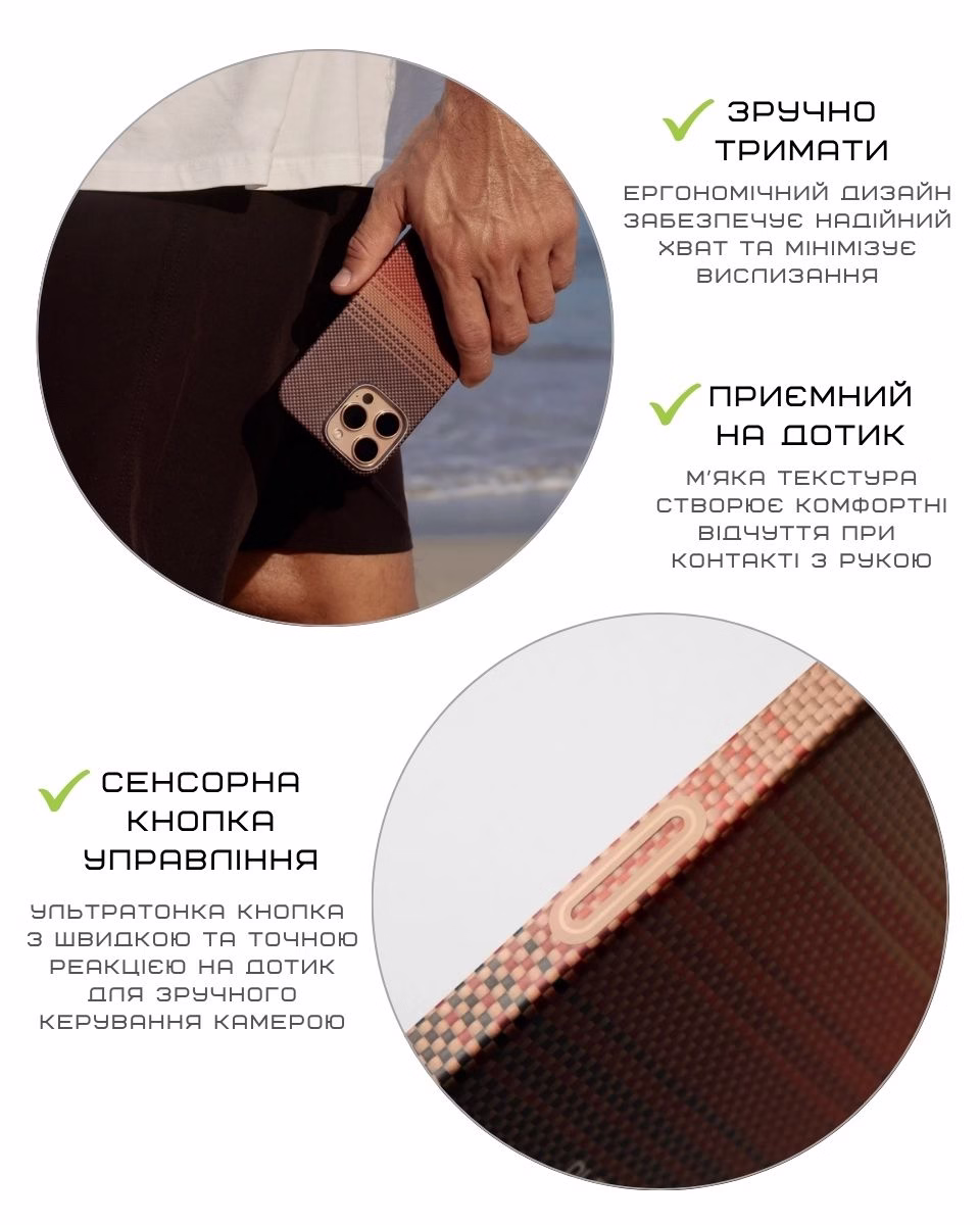 Його унікальність — у деталях. Бездоганна інтеграція технології MagSafe та особливе тактильне плетіння Sunset PitaTap забезпечують ідеальне зчеплення та неповторні відчуття. Це ідеальний чохол, що поєднує надійний захист з елегантністю.3. Як чохол впливає на функціональність iPhone?