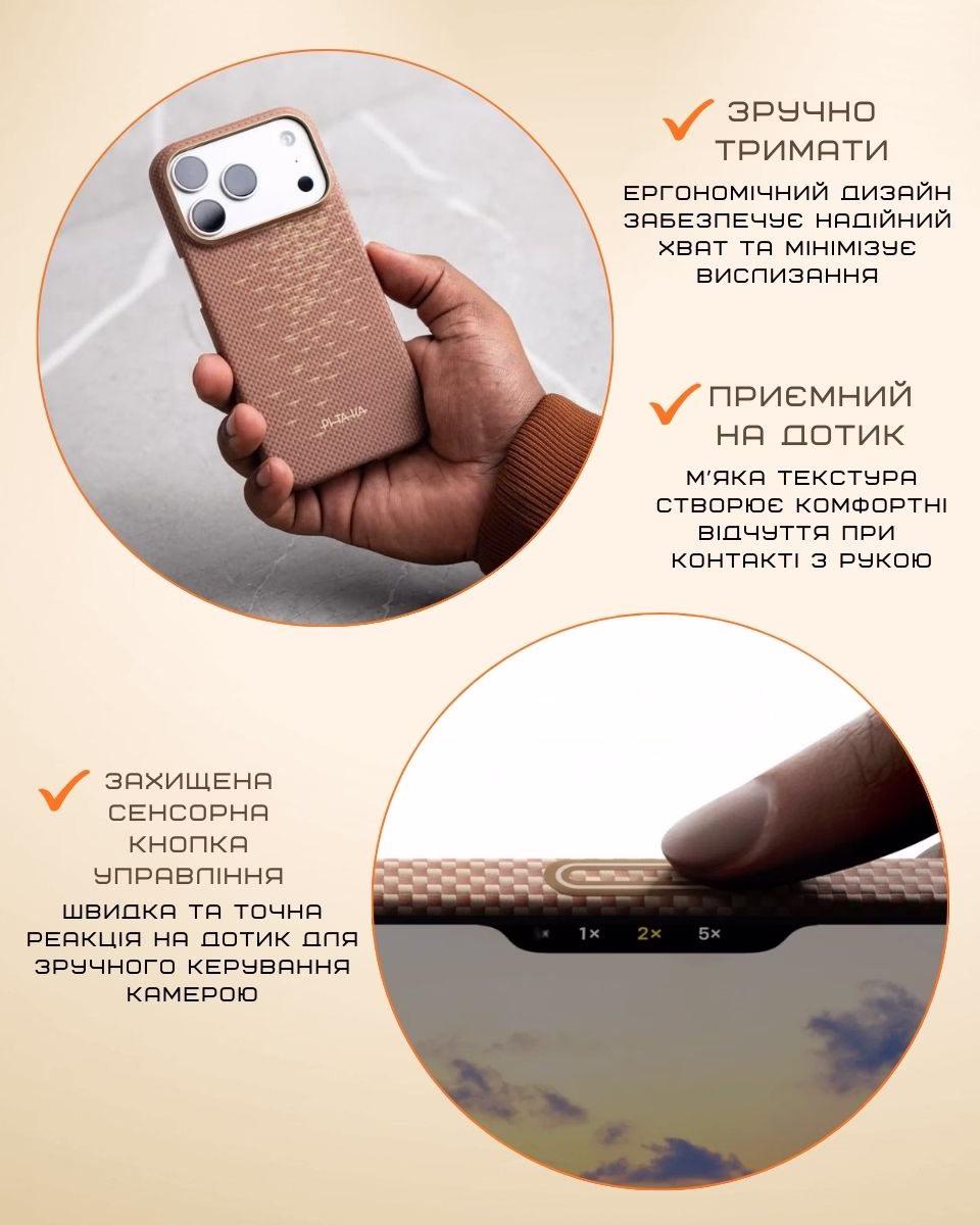 Надміцний чохол з арамідного волокна захищає телефон від несподіваних падінь, подряпин та ударів. Стильний, невагомий та надійний аксесуар преміальної якості, який не захочеться випускати з рук.