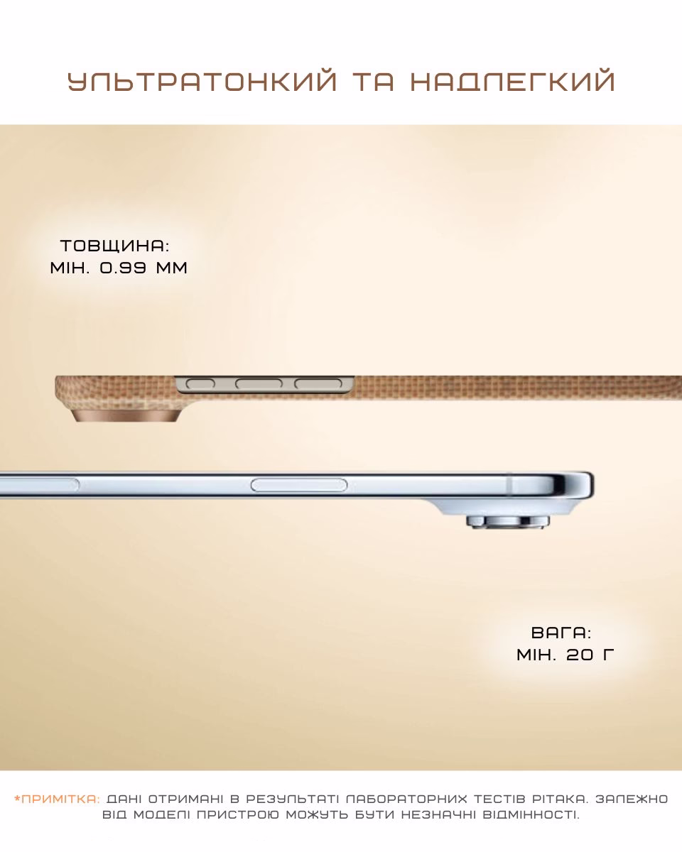 Надміцний чохол з арамідного волокна захищає телефон від несподіваних падінь, подряпин та ударів. Стильний, невагомий та надійний аксесуар преміальної якості, який не захочеться випускати з рук.
