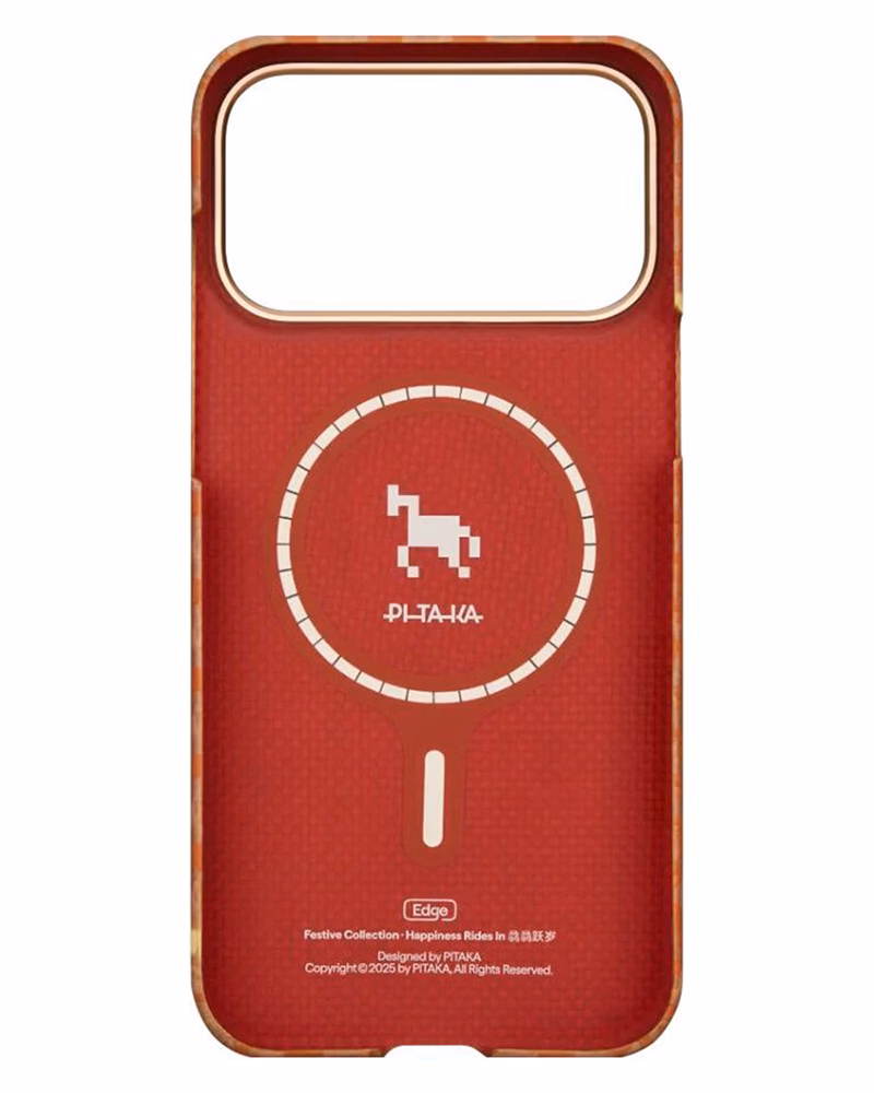 Лімітований чохол Pitaka Happiness Rides Amber для iPhone 17 Pro створений для тих, хто цінує яскраві рішення та глибокий символізм. Дизайн до Року Коня (2026) виконаний у теплих помаранчевих тонах за технологією тришарового плетіння Fusion Weave, що робить образ коня об'ємним та деталізованим.