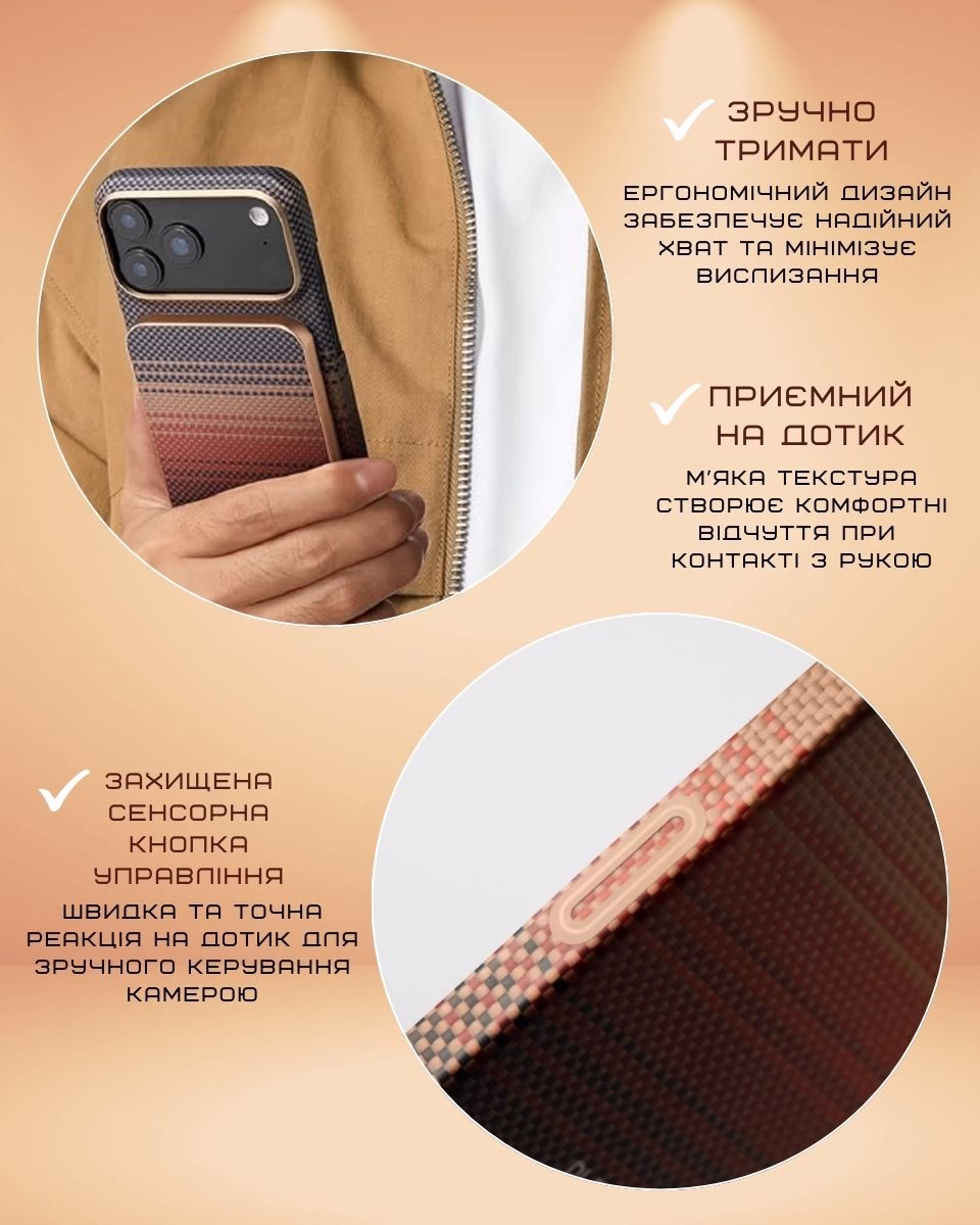 Надміцний чохол з арамідного волокна захищає телефон від несподіваних падінь, подряпин та ударів. Стильний, невагомий та надійний аксесуар преміальної якості, який не захочеться випускати з рук.
