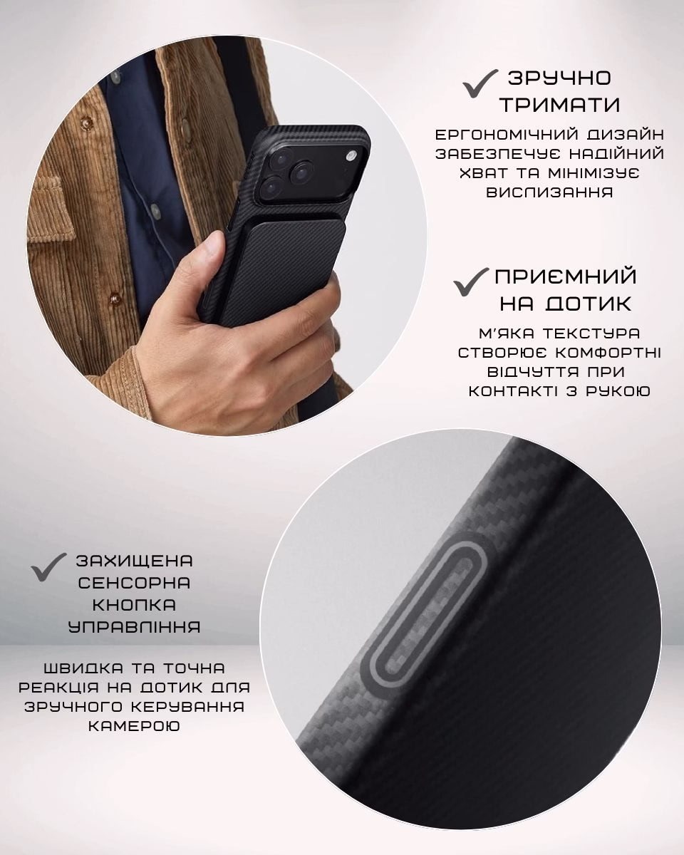 - Надійний захист: арамідне волокно ефективно протистоїть подряпинам та ударам, забезпечуючи телефону щоденну безпеку.