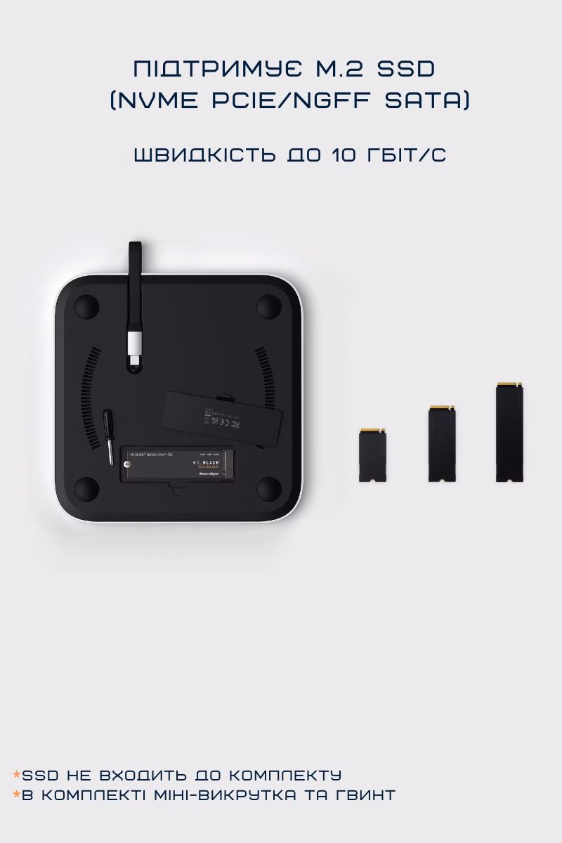 Так, пристрій підтримує M.2 SSD формати NVMe та SATA, що дозволяє швидко розширити пам’ять вашого Mac Mini.