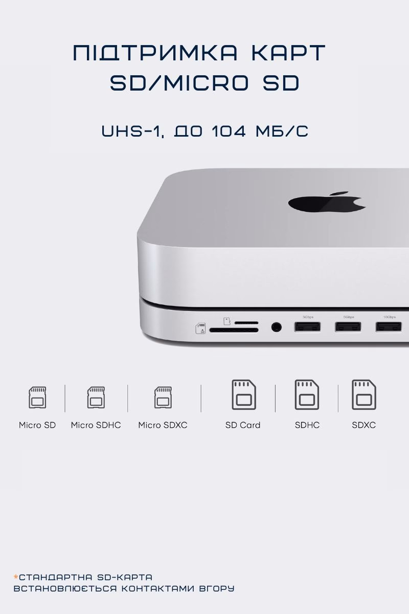 Шість портів для зручного підключення: USB-C, USB-A, два USB-A, кардридери для Micro/SD плюс аудіопорт. Ідеальне рішення для швидкого доступу до всіх потрібних пристроїв.