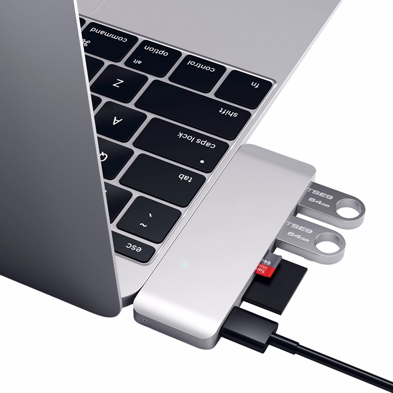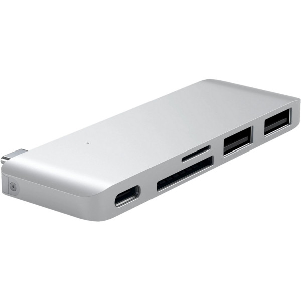 Компактний USB-хаб від Satechi обов'язково стане в нагоді користувачам нового MacBook 12" Retina. Satechi Type-C Pass Through USB Hub дозволяє не тільки легко перетворити порт Type-C на ноутбуці в цілу док-станцію, до якої можна підключити необхідні гаджети, які підтримують сполучення через стандартний роз'єм USB, але і продовжити зарядку вашого пристрою одночасно з використанням інших периферійних пристроїв. USB-хаб прекрасно працює з флешками, цифровими камерами, смартфонами, планшетами, відеокамерами, електронними книжками і багатьма іншими гаджетами, включаючи мишку або міні-вентилятор. Компактний і універсальний. Два USB-порту версії 3.0 підтримують високу швидкість передачі даних до 5 Гбіт/секунду. Крім передачі даних через USB-хаб працює в якості картрідера і оснащений слотами для SD і Micro-SD карт. Для його роботи не потрібні спеціальні програми, він розпізнається операційною системою автоматично. Satechi Type-C Combo Hub зручний у використанні, компактний і дуже практичний. Корпус хаба виготовлений з якісного алюмінію.