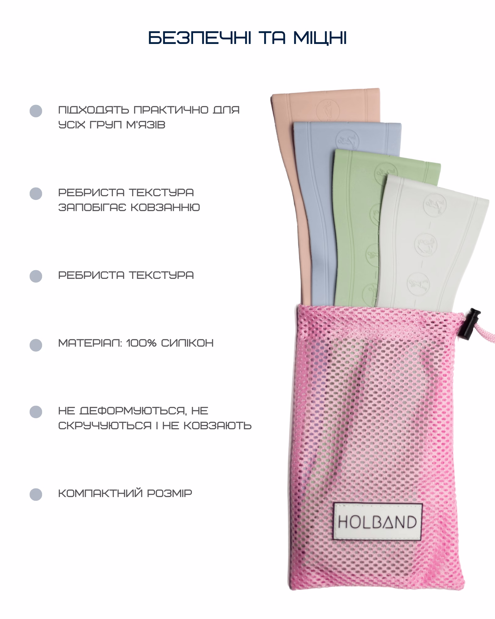 Звичайні фітнес-резинки часто натирають шкіру та не забезпечують належного комфорту під час тренувань, що може знижувати мотивацію. Резинки Holband мають широку поверхню і спеціальну ребристу текстуру, що забезпечує комфорт навіть при інтенсивних навантаженнях. Вони не ковзають і не врізаються в шкіру, дозволяючи тренуватися довше і з більшим задоволенням. Ідеально підходять для тренувань як верхньої, так і нижньої частини тіла, даючи змогу розвивати силу і витривалість без необхідності використовувати великі обтяження. Виготовлені з 100% натурального силікону, ці резинки гарантують м'якість, еластичність та максимальний комфорт під час тренувань. Вони не деформуються, не скручуються і не ковзають, що забезпечує приємний і продуктивний процес тренувань.