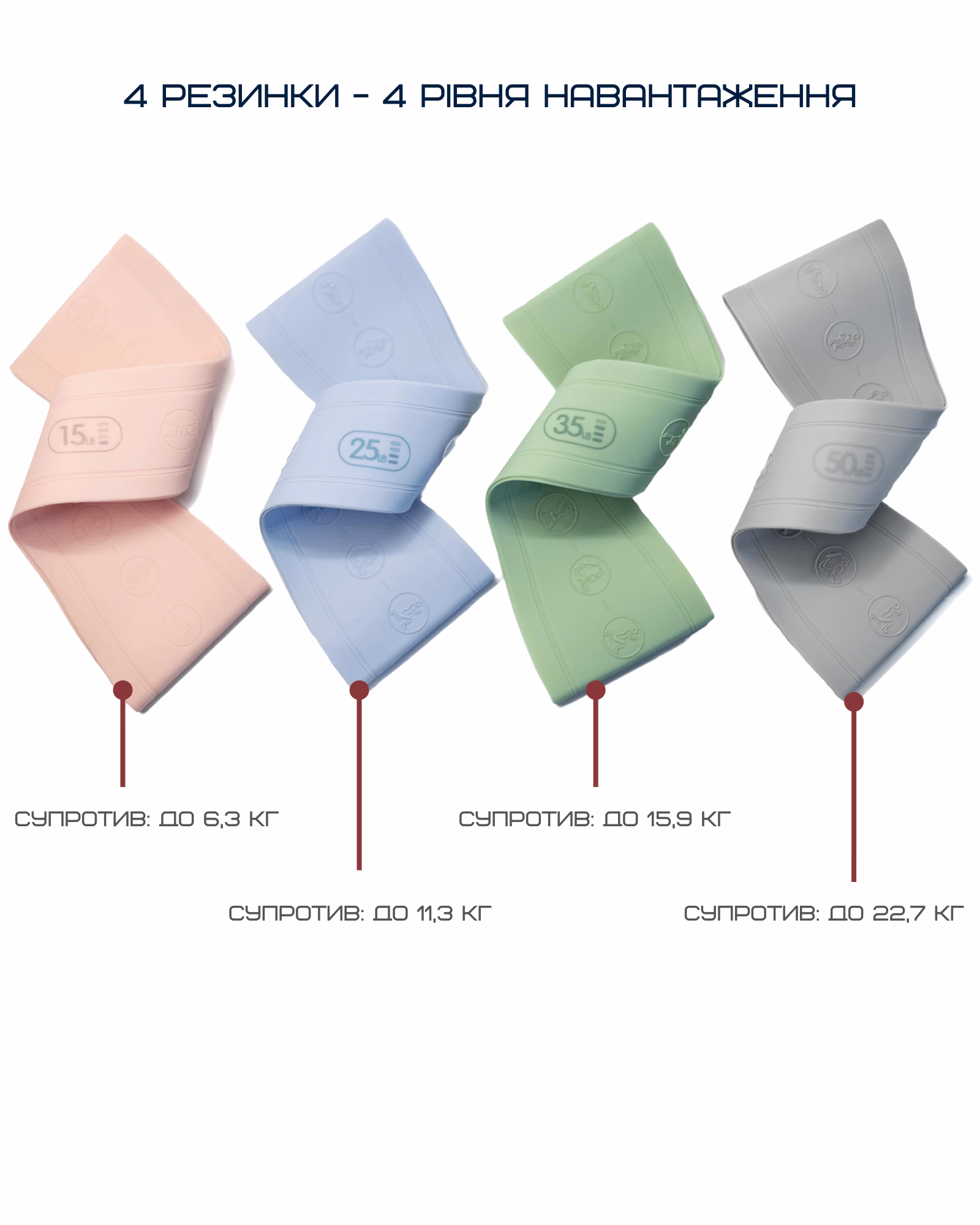 Ви шукаєте доступне і ефективне рішення для тренувань вдома, яке дозволяє працювати з власною вагою та забезпечує різні рівні навантаження для різних вправ. Набір силіконових резинок Holband стане ідеальним варіантом для тренувань вдома. Вони компактні, зручні, не потребують багато місця та забезпечують ефективне навантаження на всі групи м'язів: підходять практично для усіх груп м'язів під час тренувань, як на верхню, так і на нижню частину тіла. У наборі ви знайдете 4 резинки з різним рівнем опору: рожева: Light - до 6,3 кг, синя: Medium - до 11,3 кг, зелена: Heavy - до 15,9 кг, сіра: X-Heavy - до 22,7 кг, які дозволяють підібрати відповідний рівень жорсткості гумок для кожної вправи та рівню вашої фізичної підготовки.