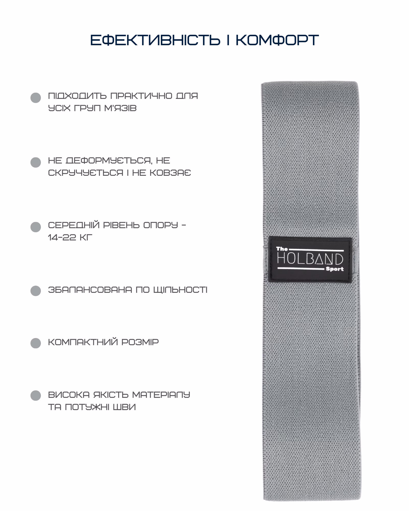 Holband Dark Grey (Medium) — це золота середина серед тканинних фітнес-резинок. Вона забезпечує помітне, але не надмірне навантаження. Ідеальний варіант для тих, хто вже в темі: якщо легкий рівень опору вже замало, а важкий ще зарано. Опір 14–22 кг дозволяє активно працювати над тонусом м’язів, витривалістю, технікою, не втрачаючи контроль над рухами. Це твій розумний рівень інтенсивності — без стресу, але з результатом.