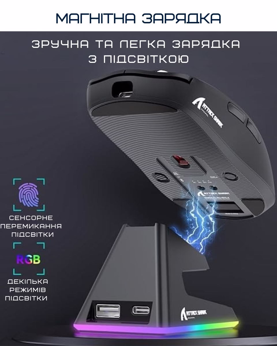 Зарядна станція має RGB-підсвічування, яке можна налаштувати за допомогою сенсорної кнопки на самій станції.3. Чи підходить миша для користувачів з великими руками?