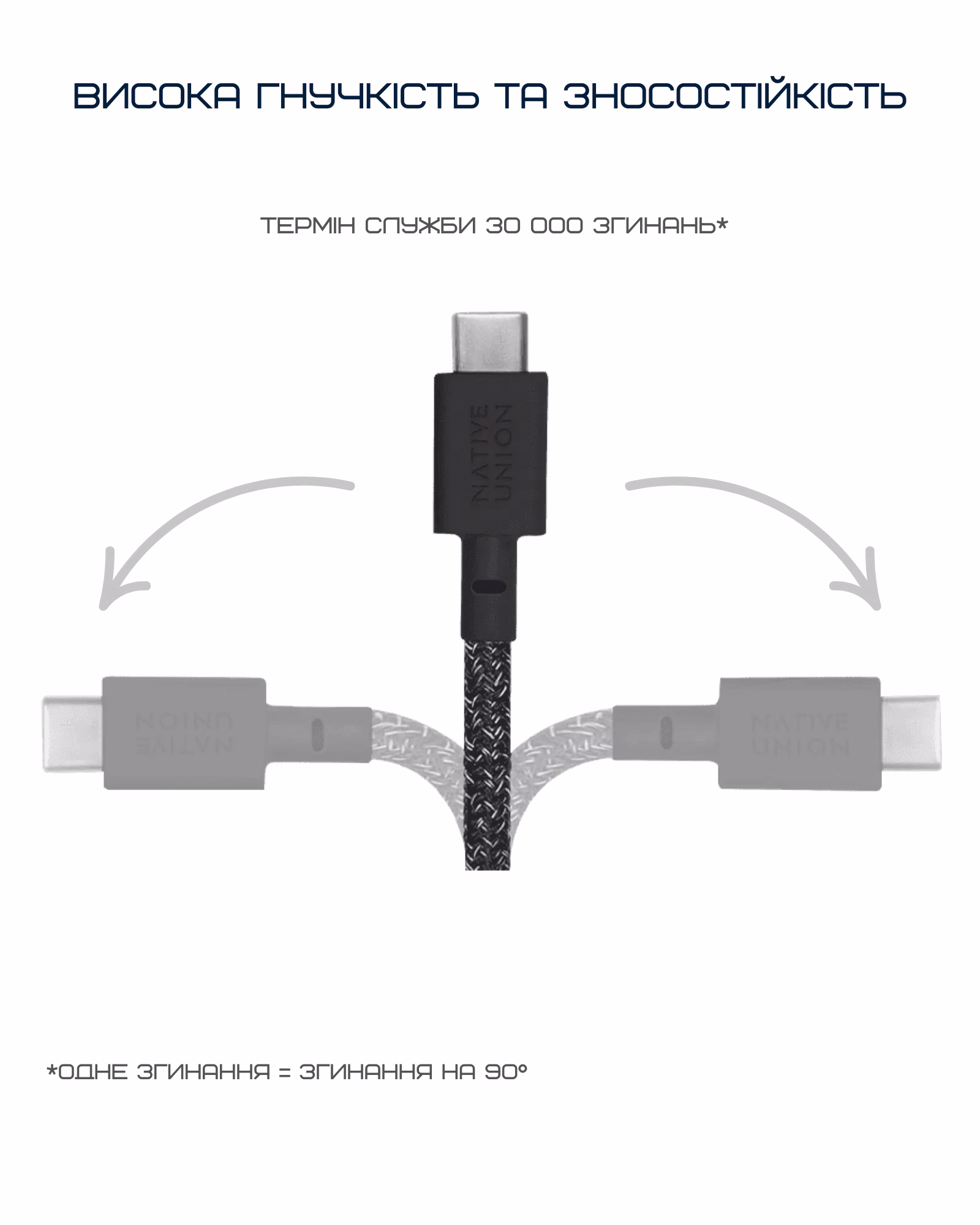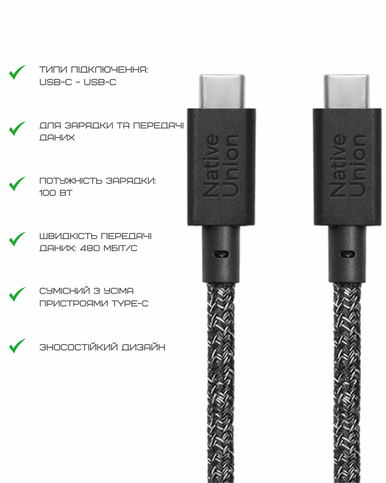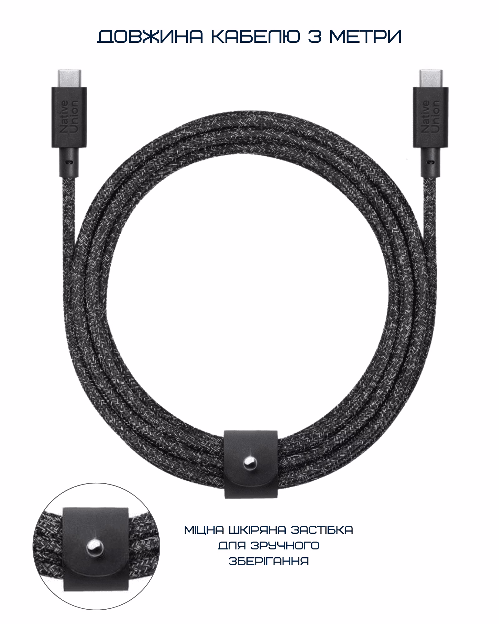 Кабель Native Union Belt XL — це не лише ефективний аксесуар, але й стильний елемент вашого робочого простору. Колір Cosmos Black та елегантний дизайн органічно впишуться в будь-який інтер’єр, додаючи естетики без шкоди для функціональності. Виготовлений із 100% переробленого ПЕТ і ТПУ, кабель поєднує міцність і екологічність. Його зносостійкість дозволяє витримувати усі перекручування і заплутування, гарантуючи довговічність в будь-яких умовах.