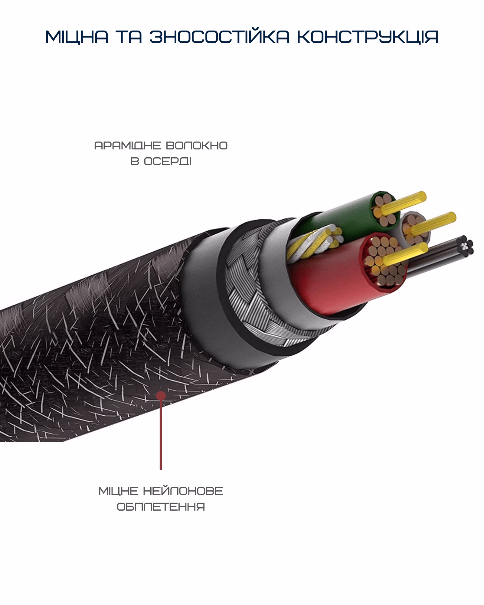 - Витривалість і міцність: тканинне обплетення з арамідною серцевиною гарантує довговічність навіть при інтенсивному використанні.