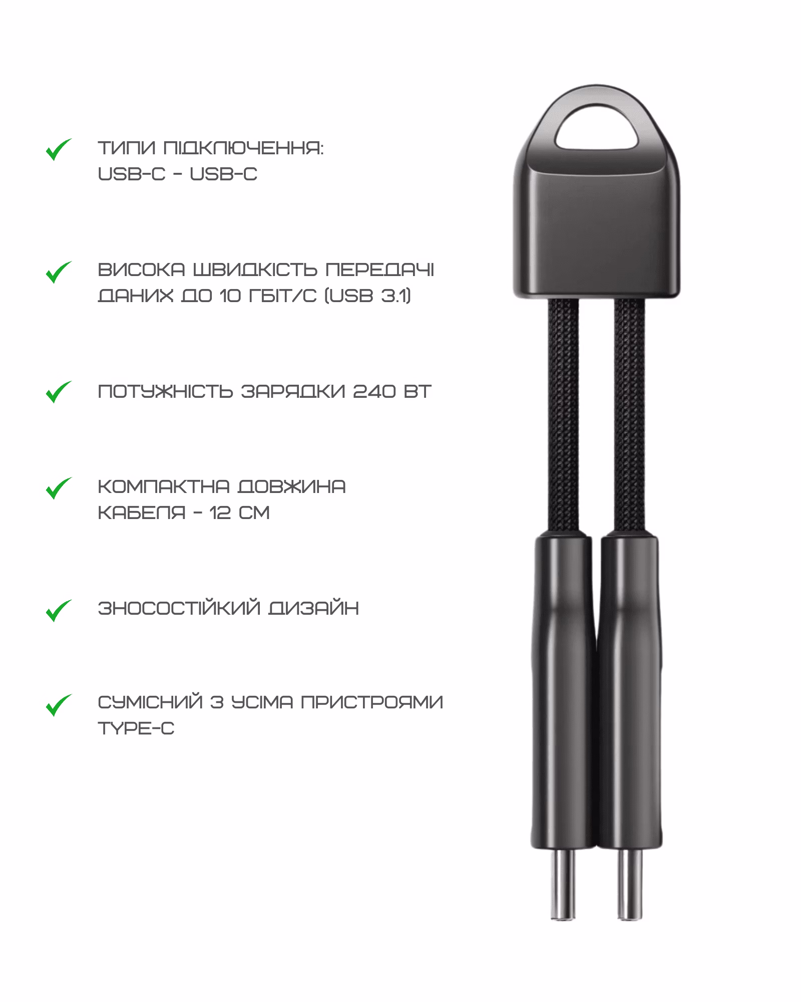 - Завжди під рукою: ультракомпактний кабель у вигляді брелока — заряджайте і передавайте дані зі швидкістю до 10 Гбіт/с (USB 3.1) будь-де без зайвого клопоту.