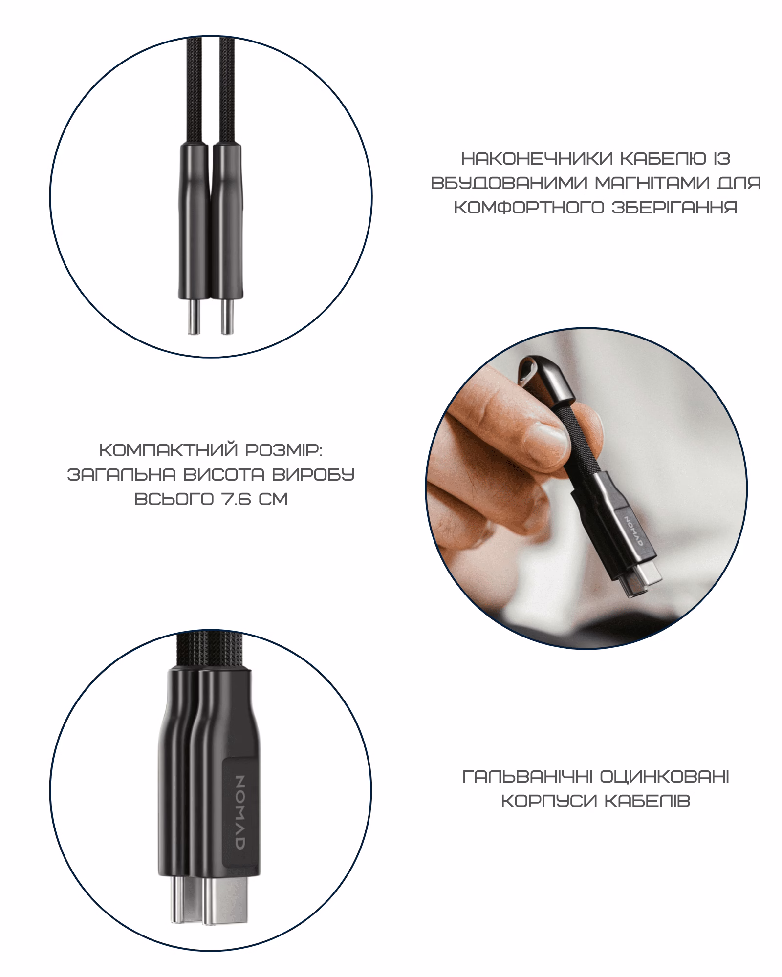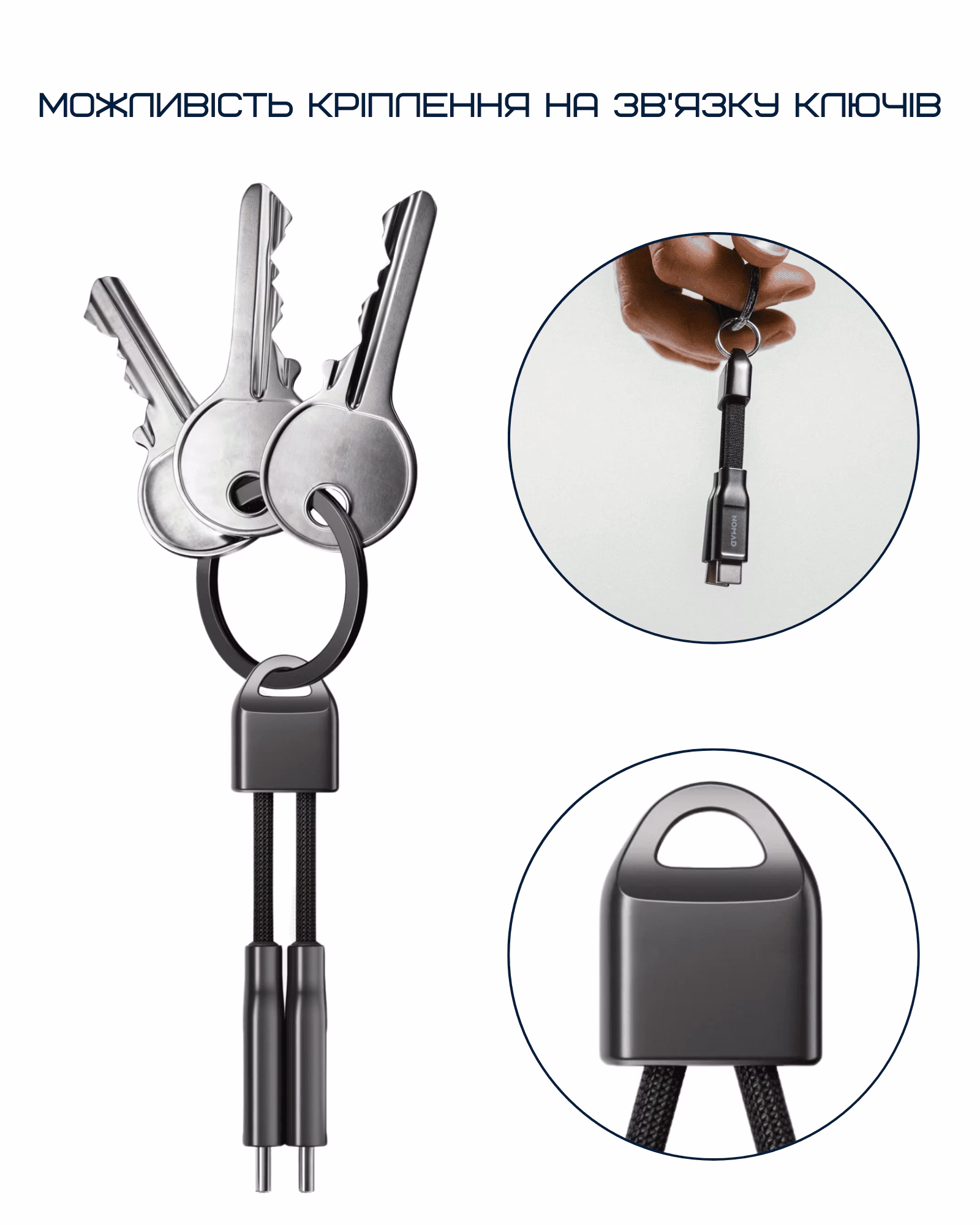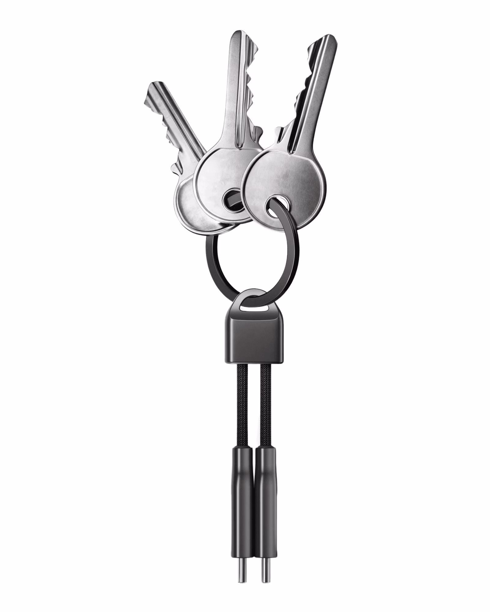 Для Вас важливі мобільність і ефективність, Ви хочете завжди мати під рукою надійний кабель, який не заплутається, не зламається і не підведе у вирішальну мить. Розроблений з урахуванням портативності, ChargeKey легко поміщається в долоні та непомітно висить на вашому брелоку. Завдяки вбудованим магнітам у наконечниках кабель надійно тримається у складеному вигляді. Плетена нейлонова оболонка і цинкові наконечники з гальванічним покриттям забезпечують неймовірну довговічність навіть в умовах активного використання. Це не просто аксесуар — це надійний партнер на кожен день.