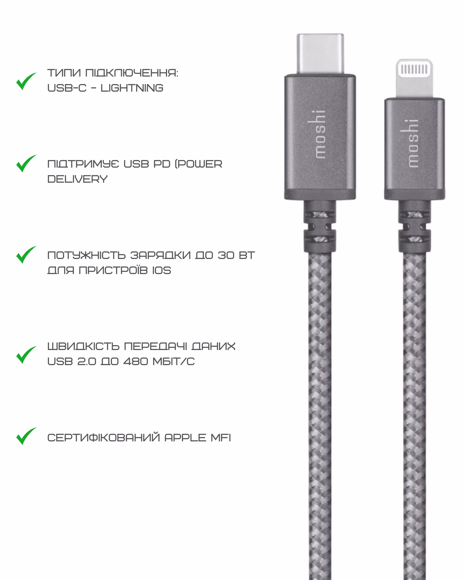 Коли Ваш день сповнений зустрічей і справ, кожна хвилина має значення. Завдяки підтримці технології Power Delivery (PD) та високій пропускній здатності до 30 Вт, Moshi Integra™ Cable забезпечує миттєву зарядку вашого iPhone, iPad або іншого пристрою з Lightning-роз'ємом. Більше жодних затримок — лише швидке підключення та ефективність. Порадує Вас і висока швидкість передачі даних - USB 2.0 до 480 Мбіт/с.