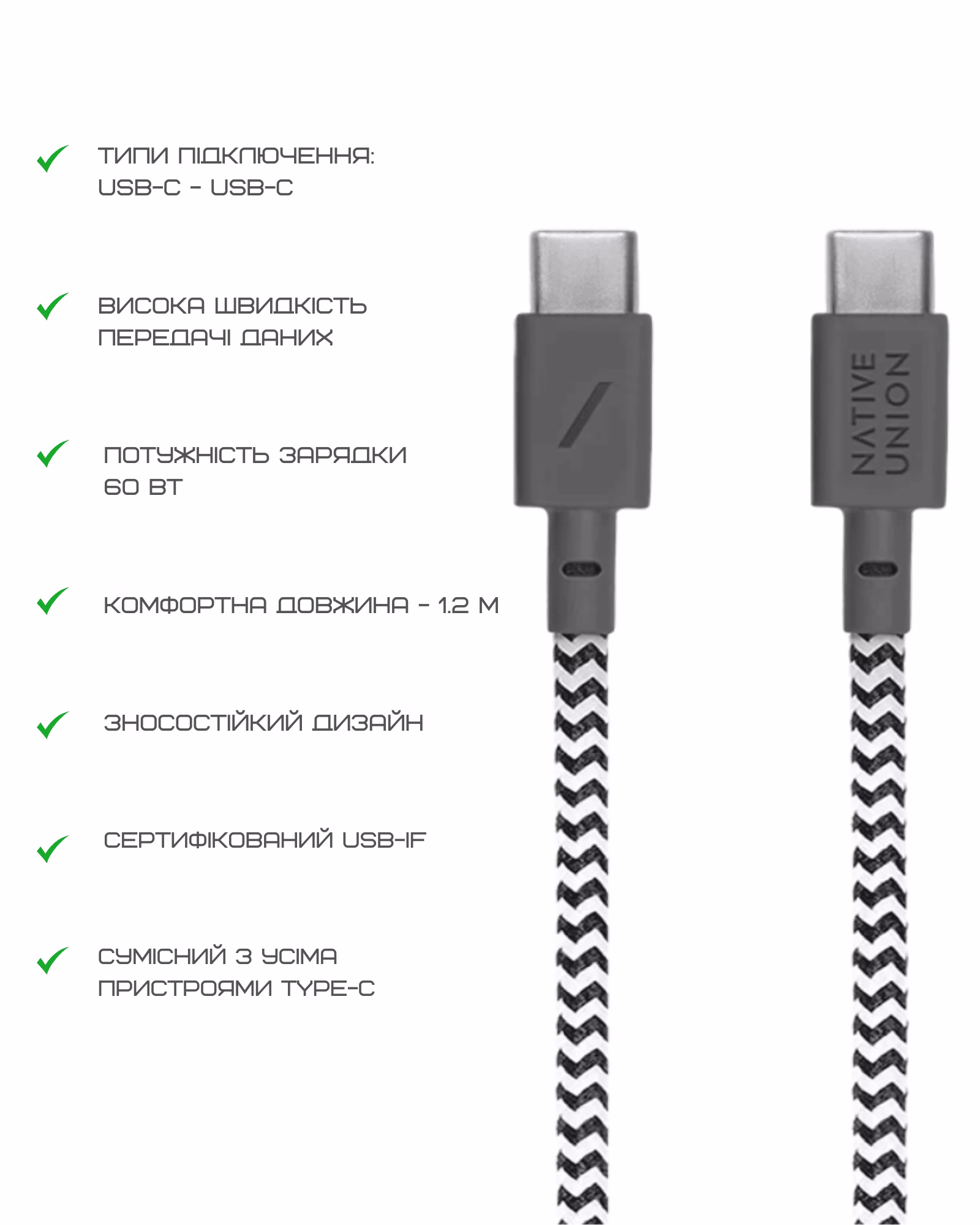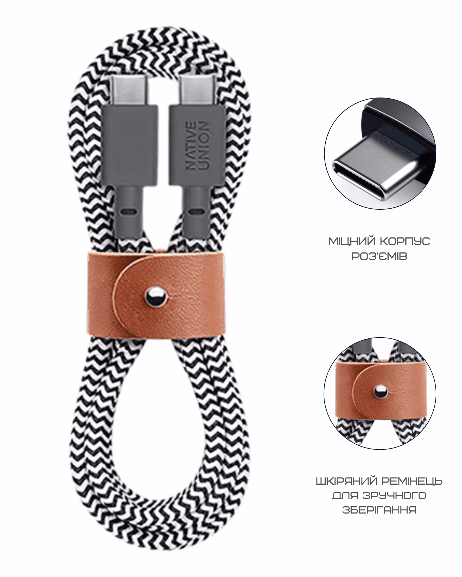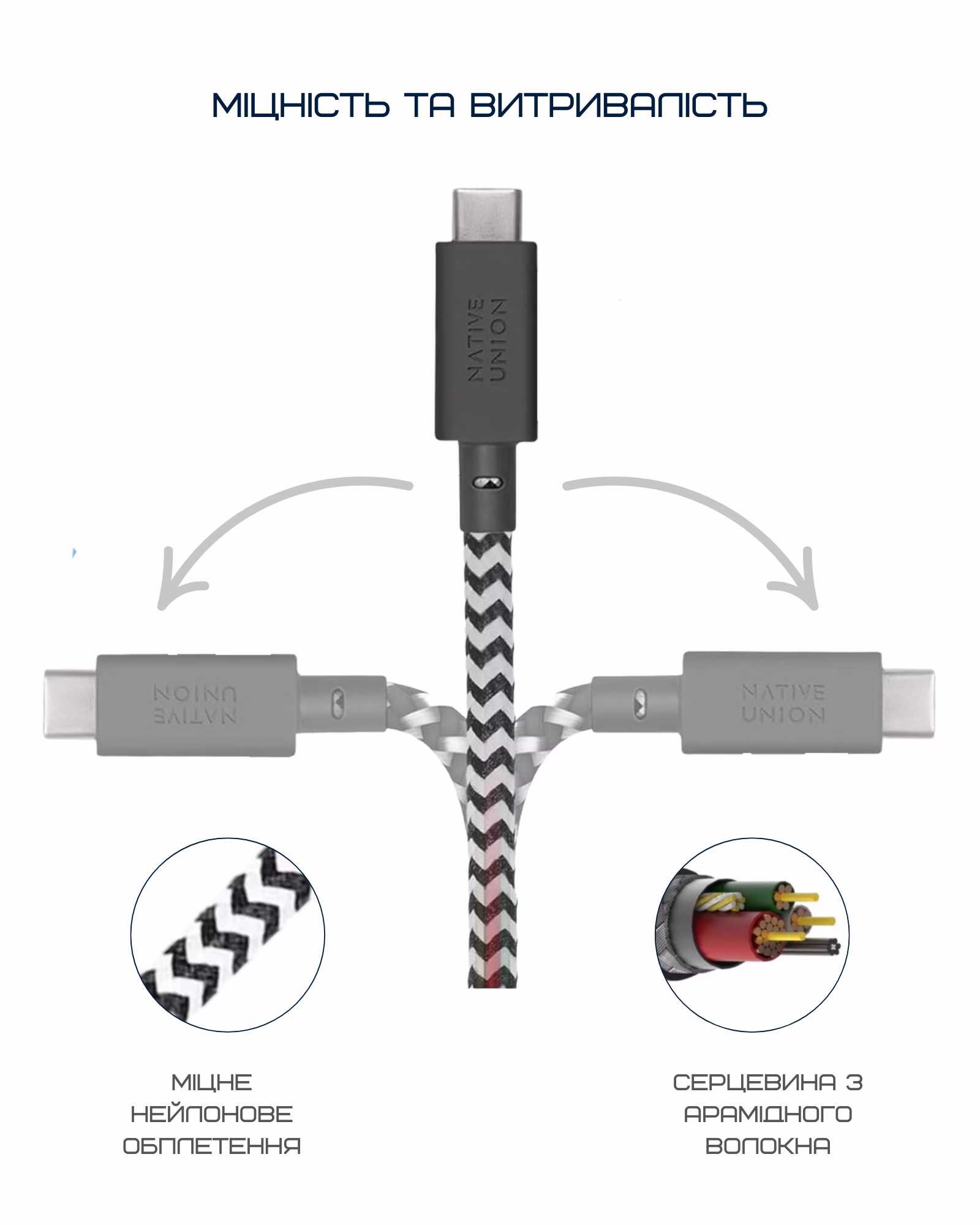 У сучасному світі, де кожна хвилина на рахунку, Ви не можете дозволити собі витрачати час на довгі зарядки чи повільну передачу даних. Кабель USB-C to USB-C Native Union Belt Cable з довжиною 1.2 м надає можливість швидкої зарядки та миттєвої передачі даних для всіх Ваших пристроїв. Кожен заряд стає ефективним, адже потужність 60 Вт дозволяє заряджати навіть потужні пристрої, не чекаючи годинами. Крім того, кабель дозволяє без втрат якості передавати файли: документи, фотографії, відео — все це Ви зможете передавати за лічені секунди, що дозволить Вам зекономити час та зосередитись на важливих справах.