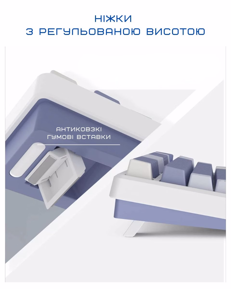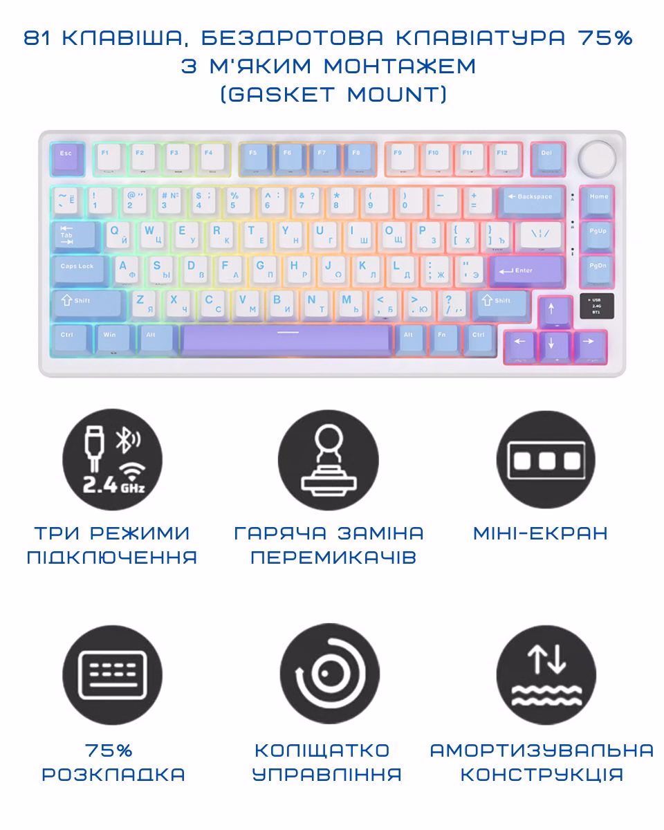 - 75% формат: компактна розкладка на 81 клавішу без цифрового блоку економить місце, але не жертвує функціональністю. Завдяки прокладці між корпусом і платою, натискання клавіш звучать м'яко, а відчуття — приємне та більш пружне