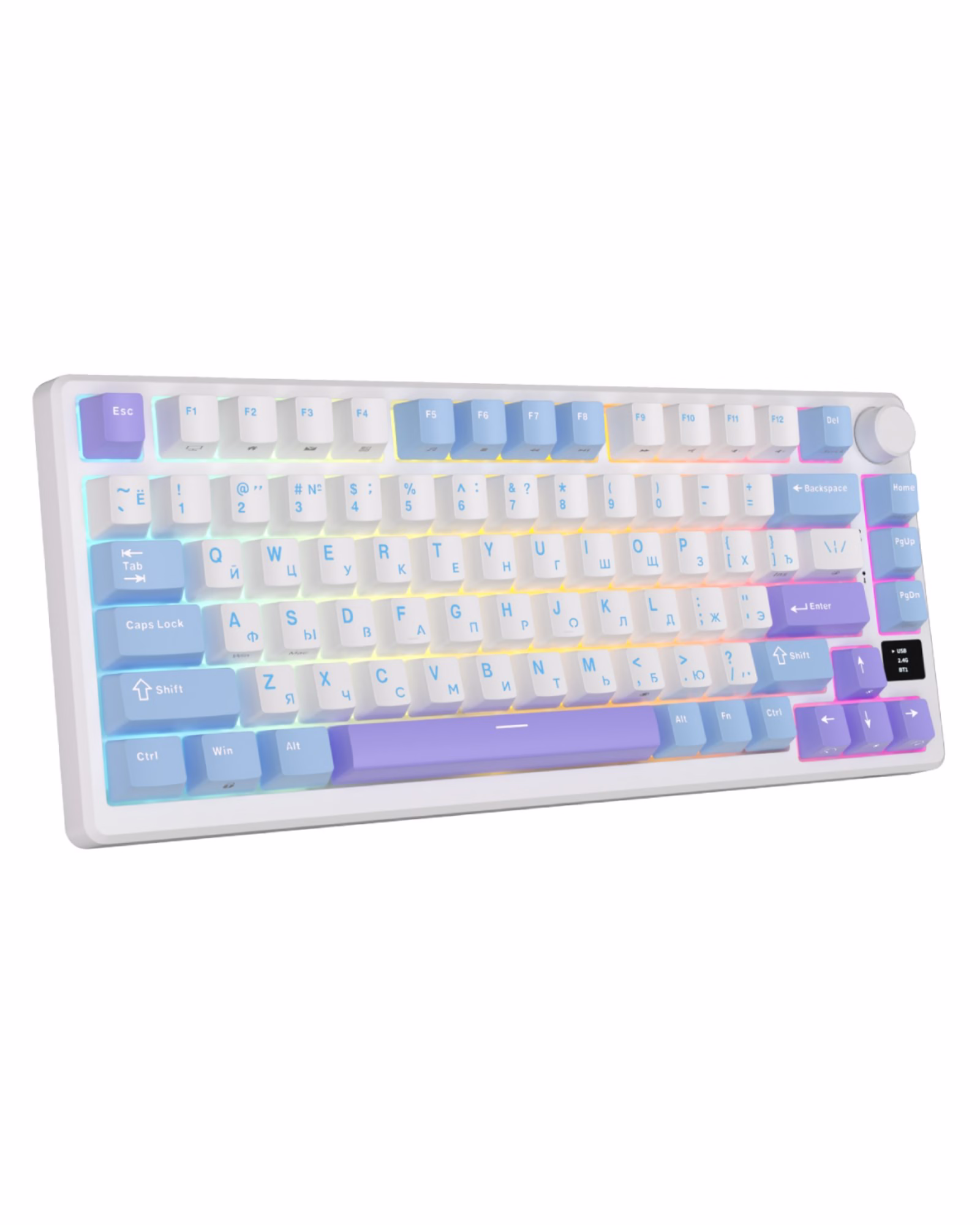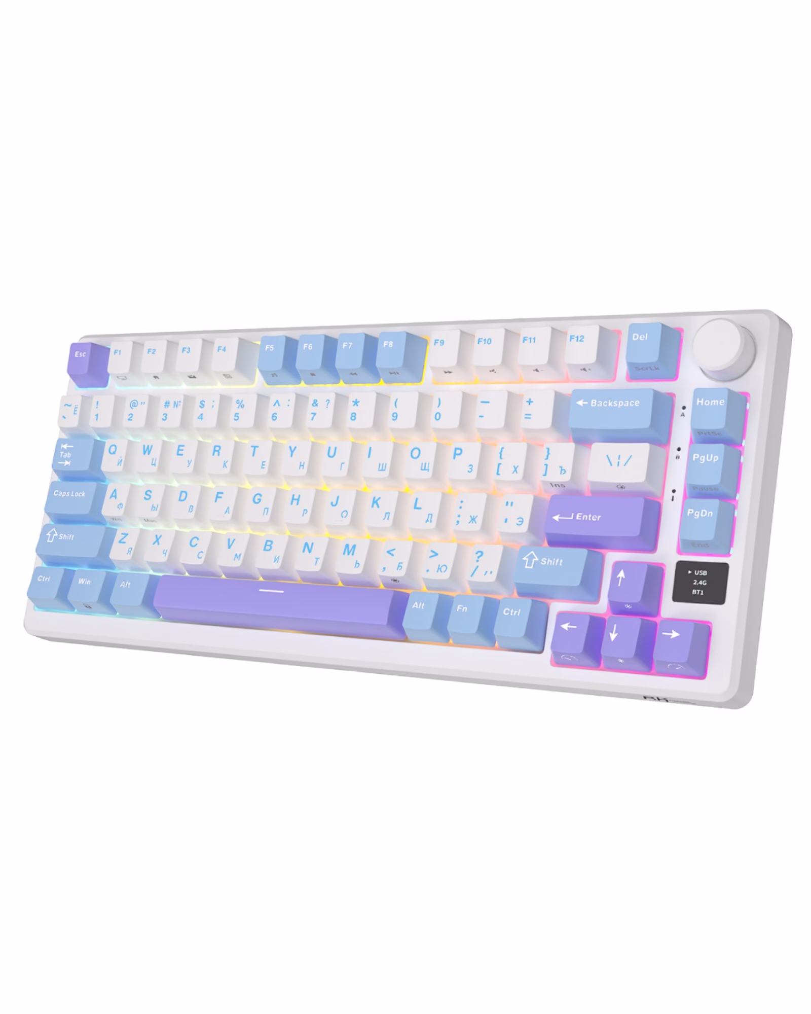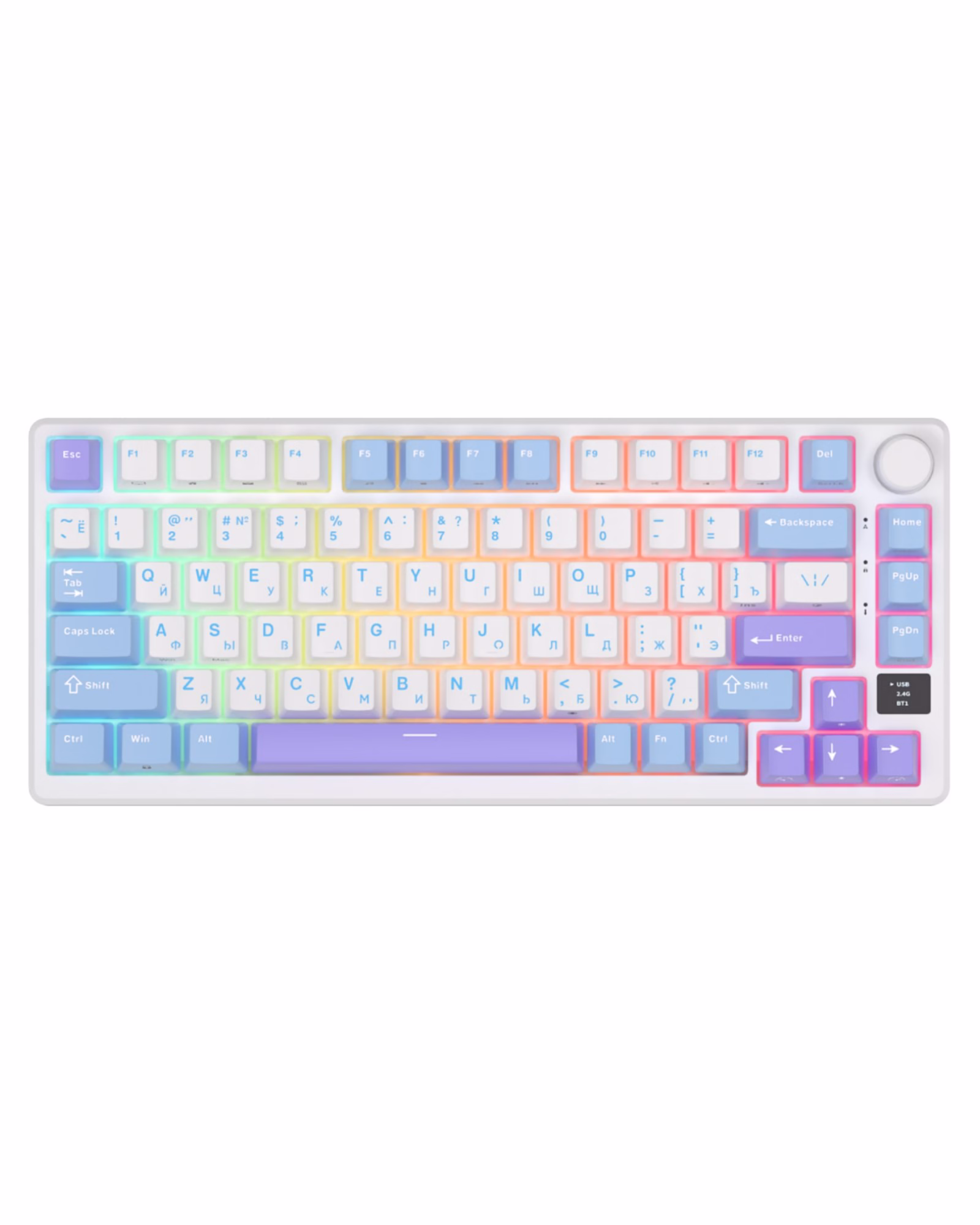 Так. Формат 75% зберігає усі потрібні клавіші, включаючи стрілки та функціональні — просто без цифрового блоку. Менше зайвого, більше простору.2. OLED-екран і колесо — це реальна користь чи просто фішка?