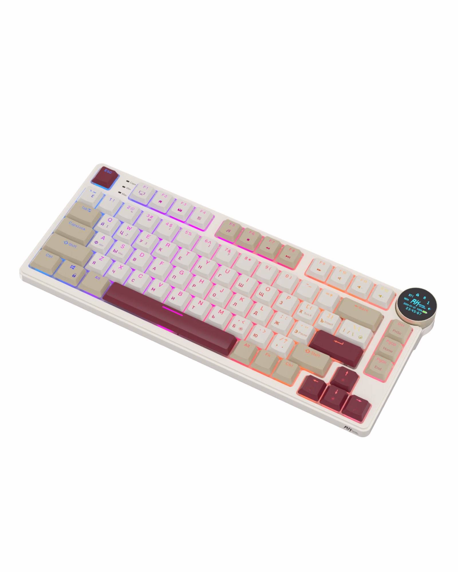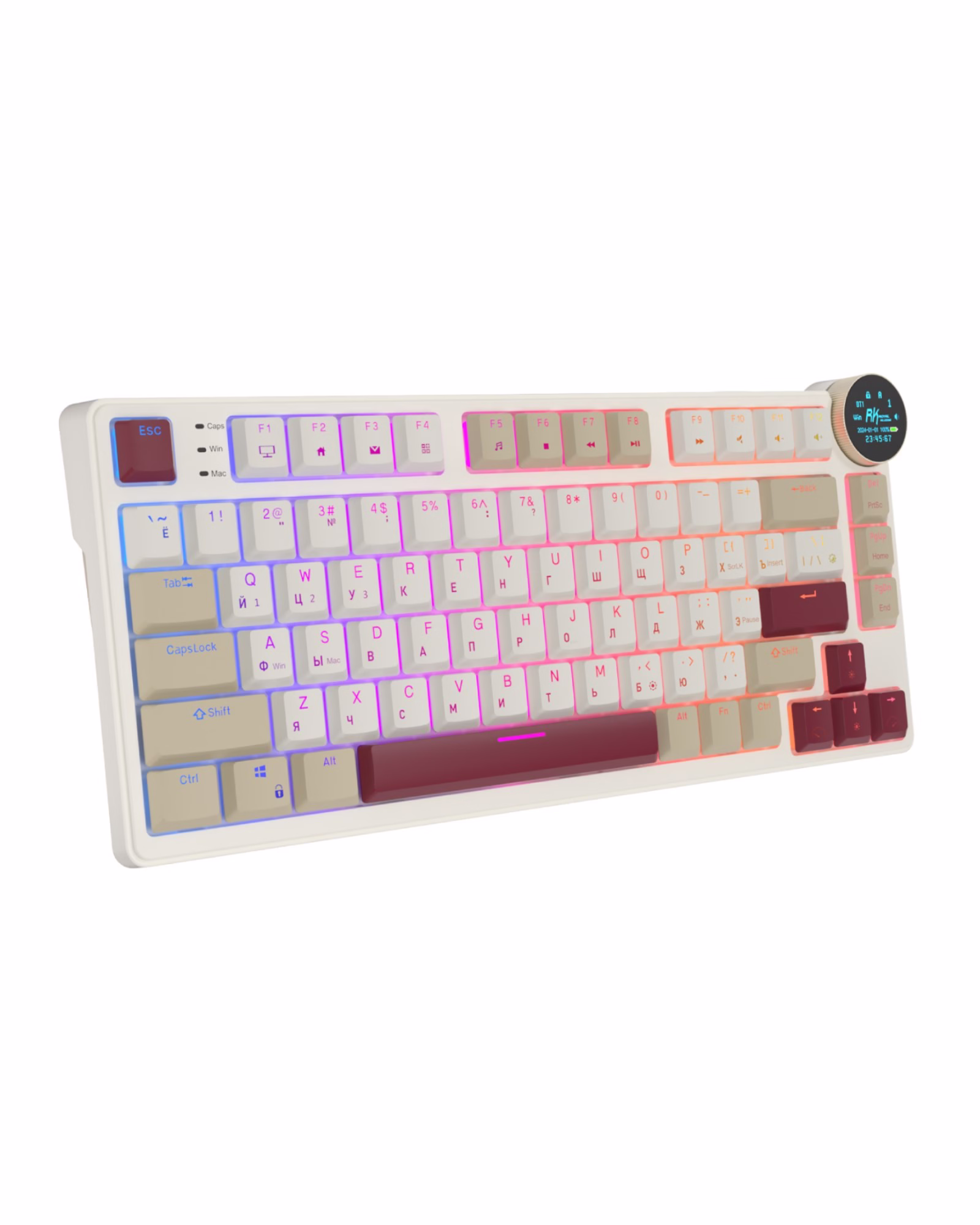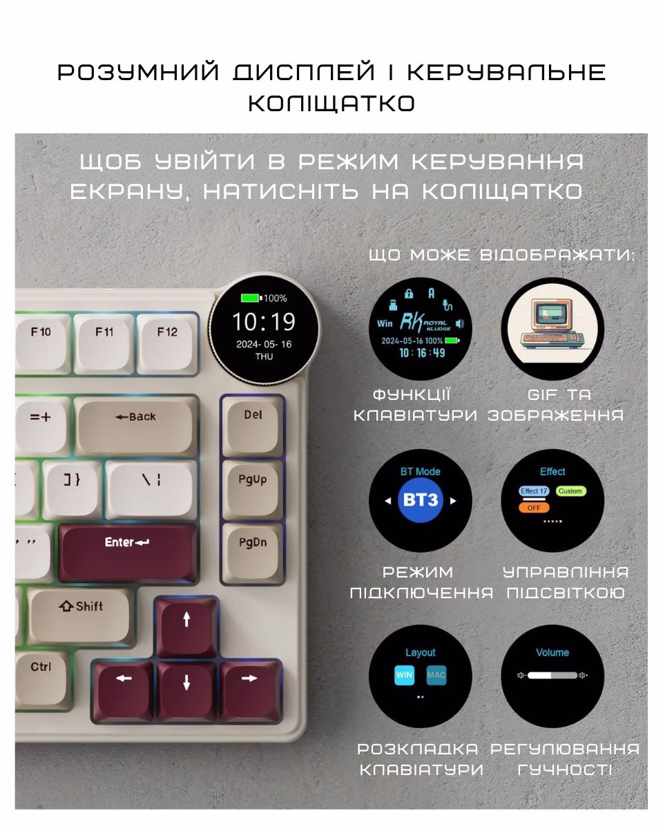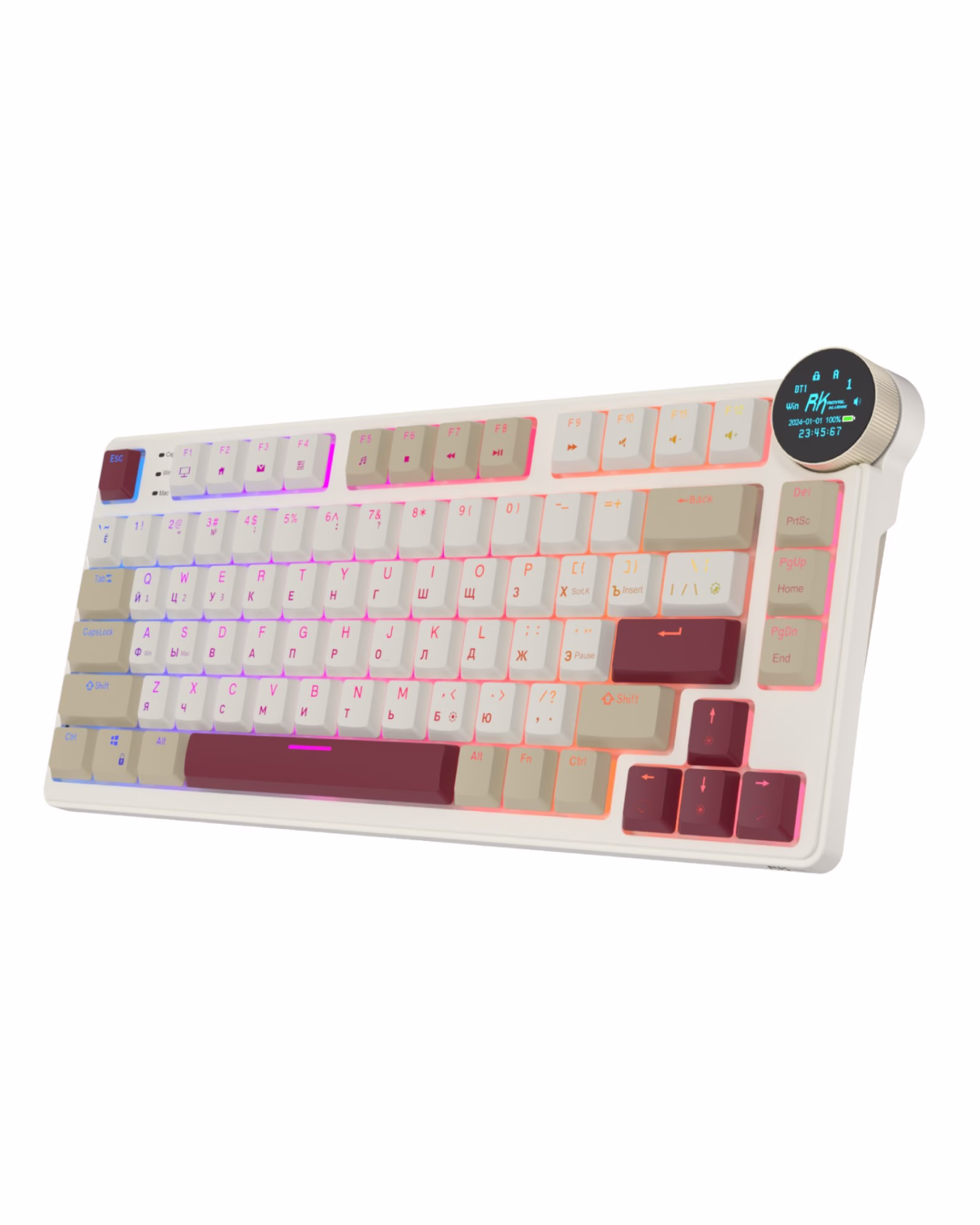 - Інтегрований міні‑екран з коліщатком: динамічний дисплей відображає на маленькому екрані власні GIF-файли, дати, режими підключення, розкладки WIN/MAC та стан батареї. Повернувши коліщатко можна відрегулювати гучність, яскравість/швидкість підсвічування та режими/кольори RGB-підсвітки